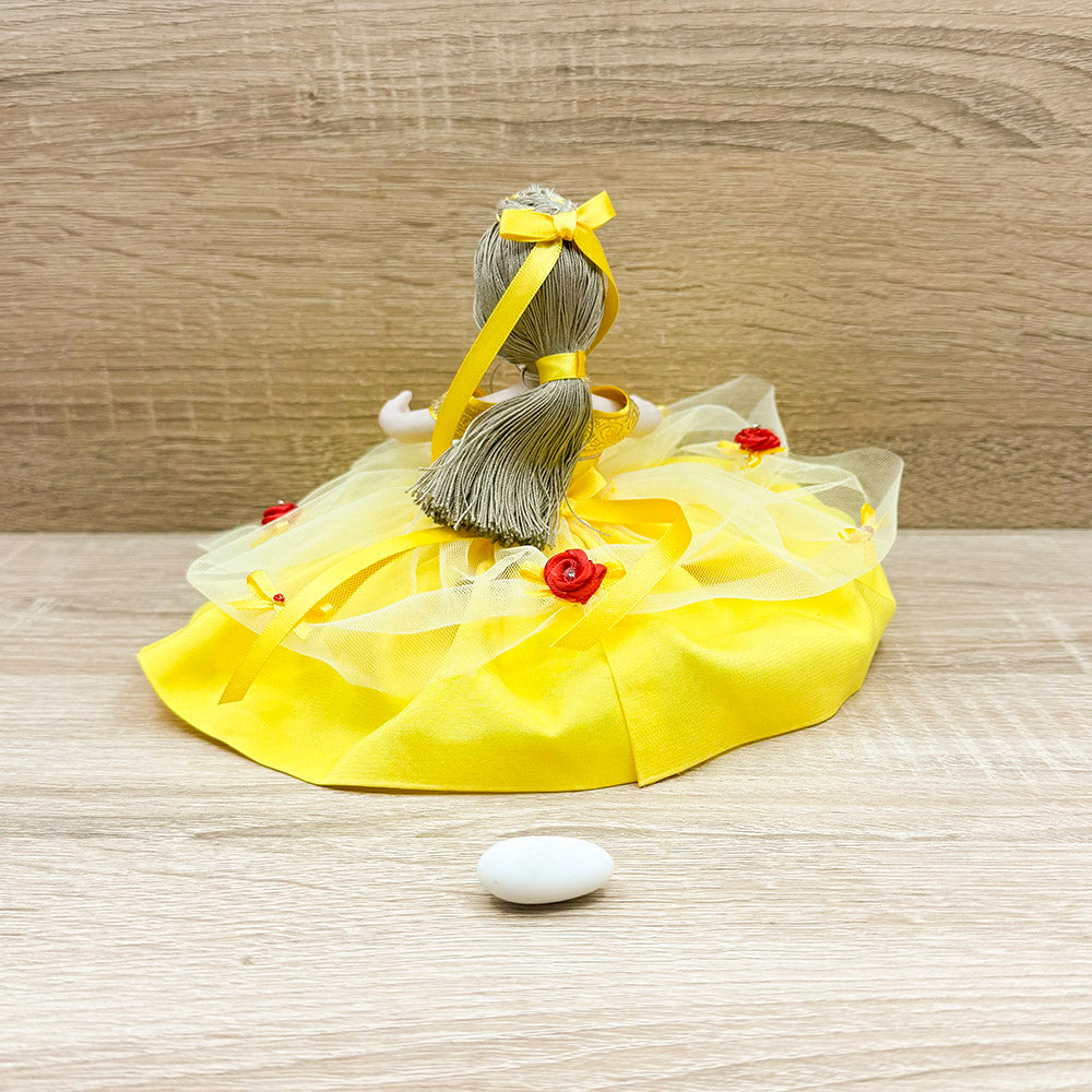 Bambola decorativa, vestita con elegante abito in color giallo, firmato Averla Bomboniere.