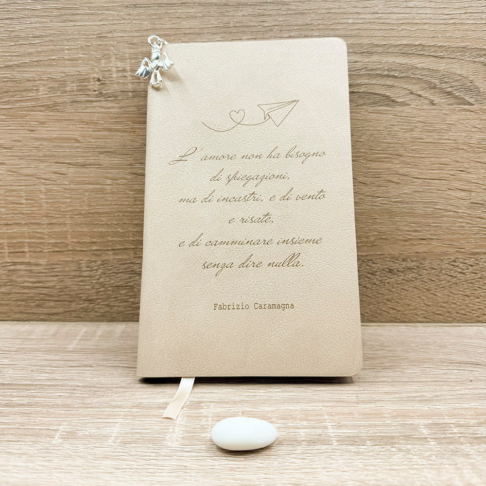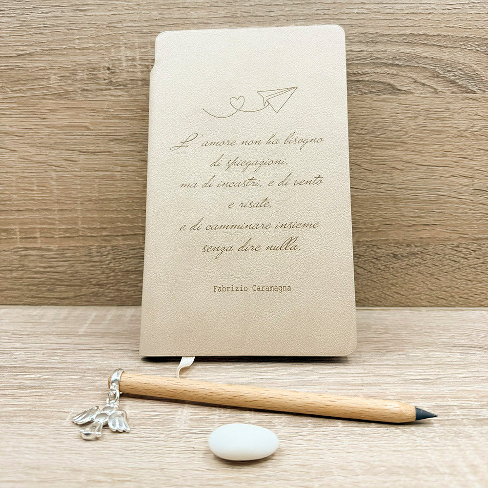 Eleganza, sostenibilità e artigianalità si incontrano in questo raffinato blocco note similpelle, impreziosito da una frase ispirazionale incisa sulla copertina. Un compagno perfetto per pensieri, appunti e idee da custodire nel tempo.