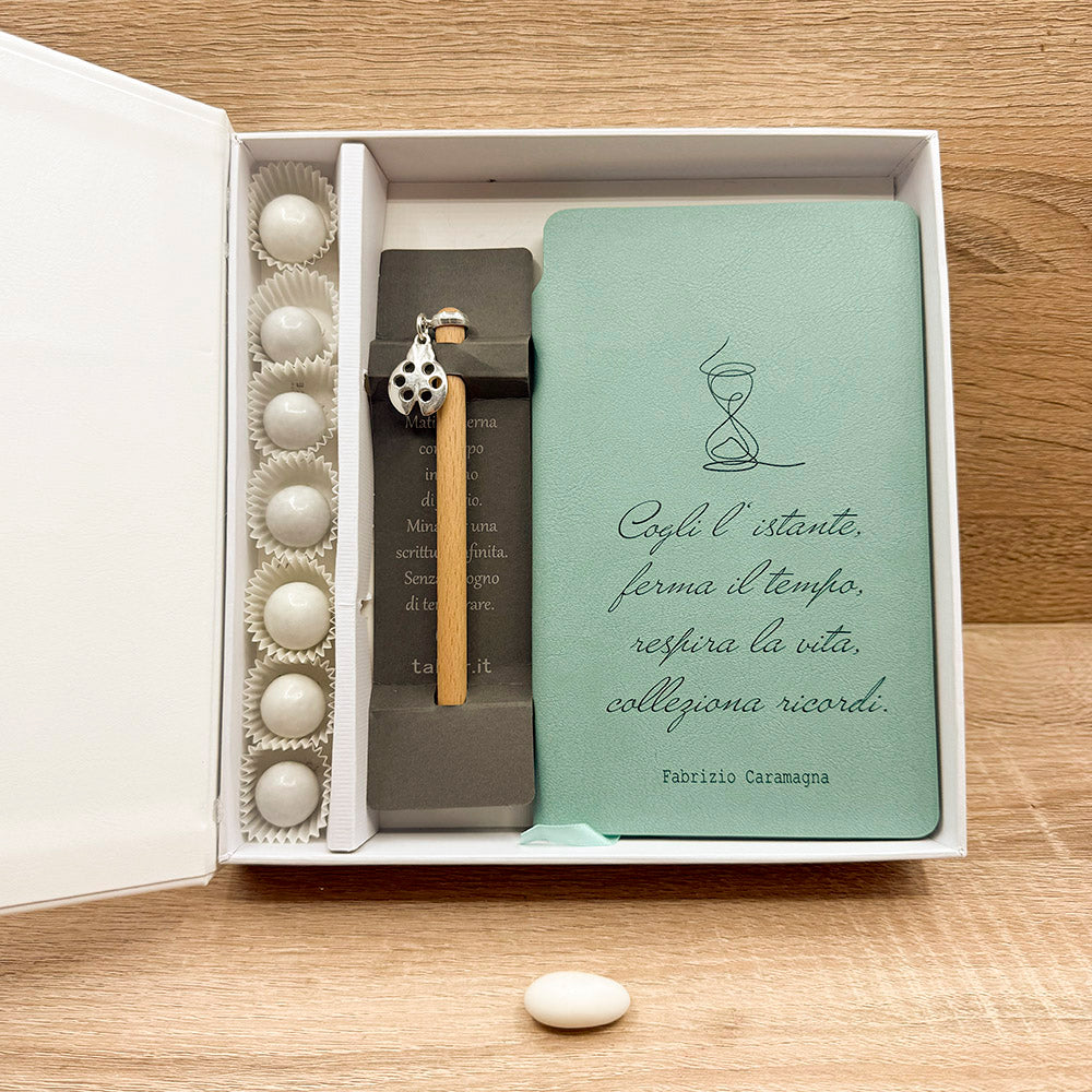Accanto alla matita, un ciondolo ricoperto in argento con finitura lucida aggiunge un tocco di luce e raffinatezza, rendendo questo set un oggetto unico e dal design esclusivo.
