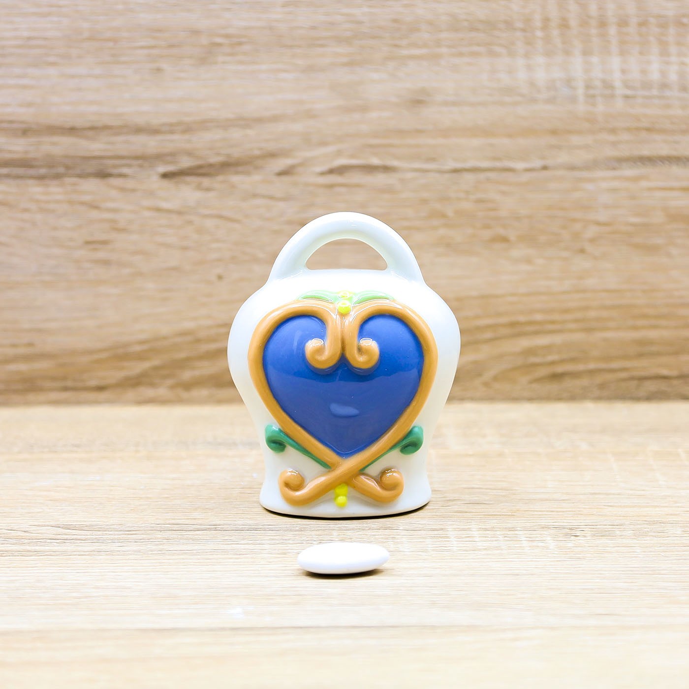 Campana bianca con decori in blu, arancio, giallo e verde, in Porcellana di Capodimonte, firmato Pienne Design.