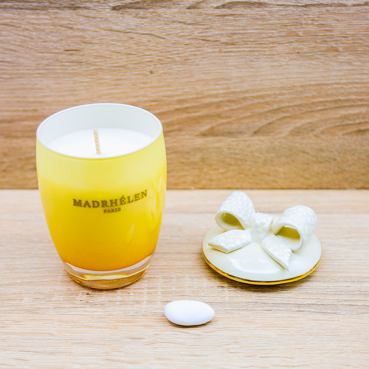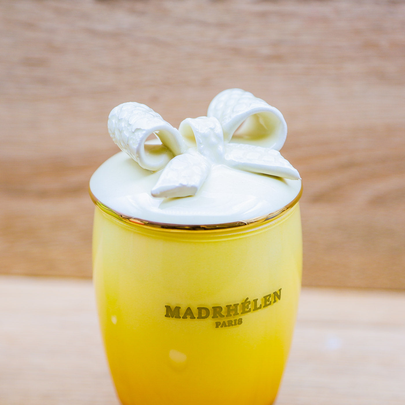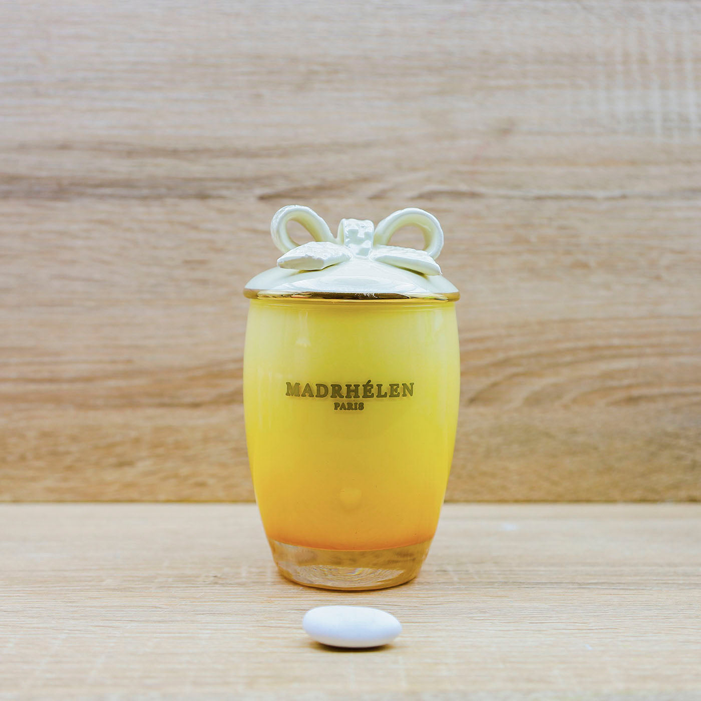 Candela Profumata in vetro dai colori vibranti che sfumano dall'arancio al giallo, tappo in porcellana con un fiocchetto che dona alla candela un tocco di romanticismo, firmato Madrhèlen.