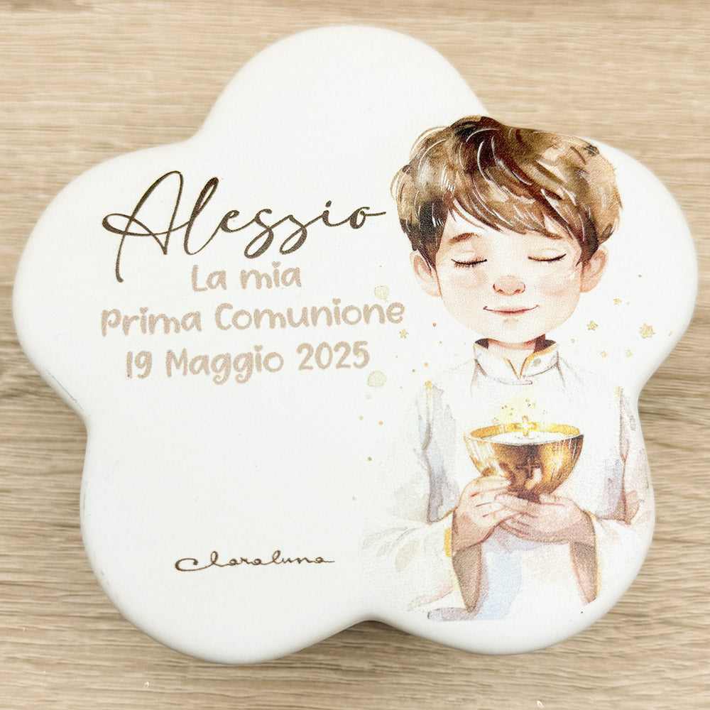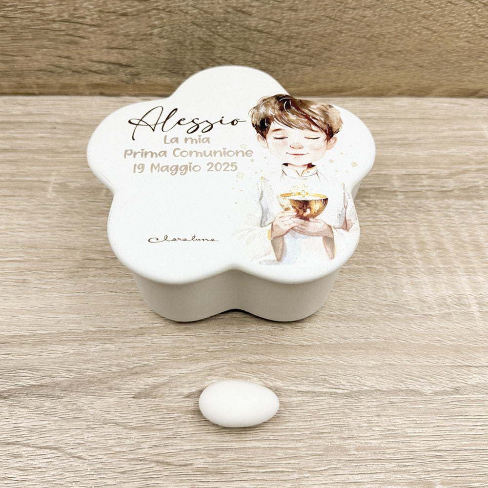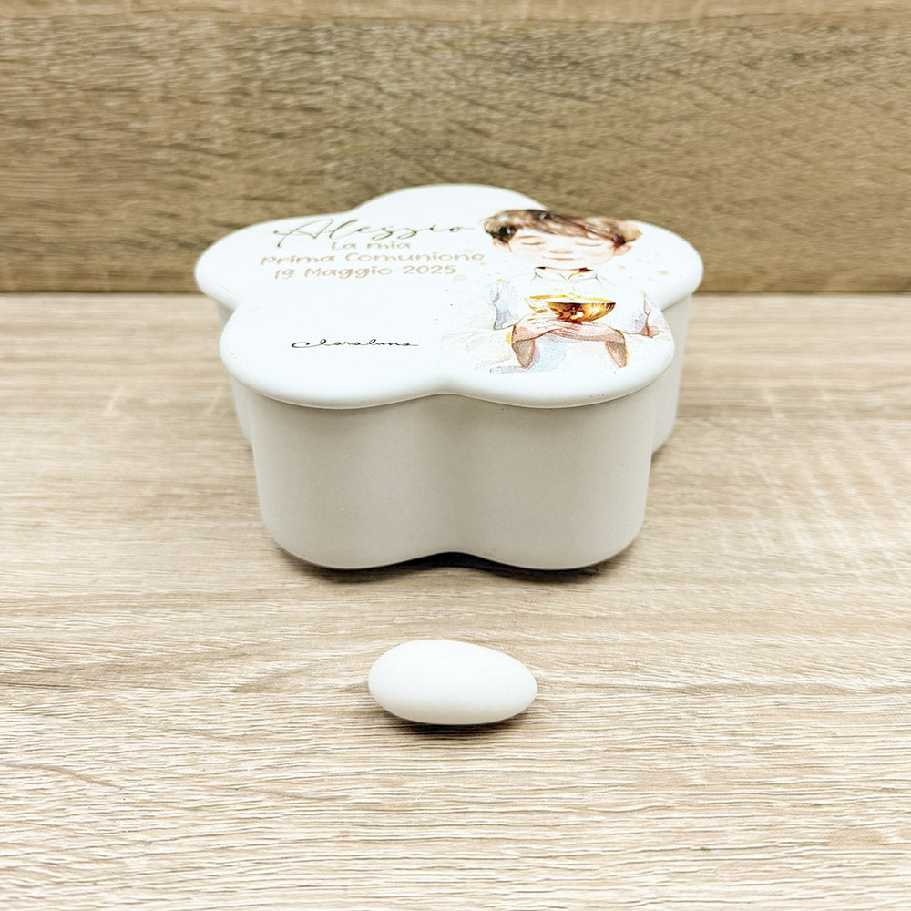 Il prezzo con la confezione comprende:Astuccio, Doppio Nastro, Gessetto o Fiore a Scelta, Portaconfetti e 5 Confetti.