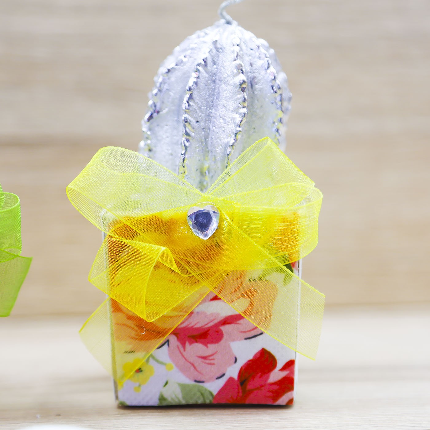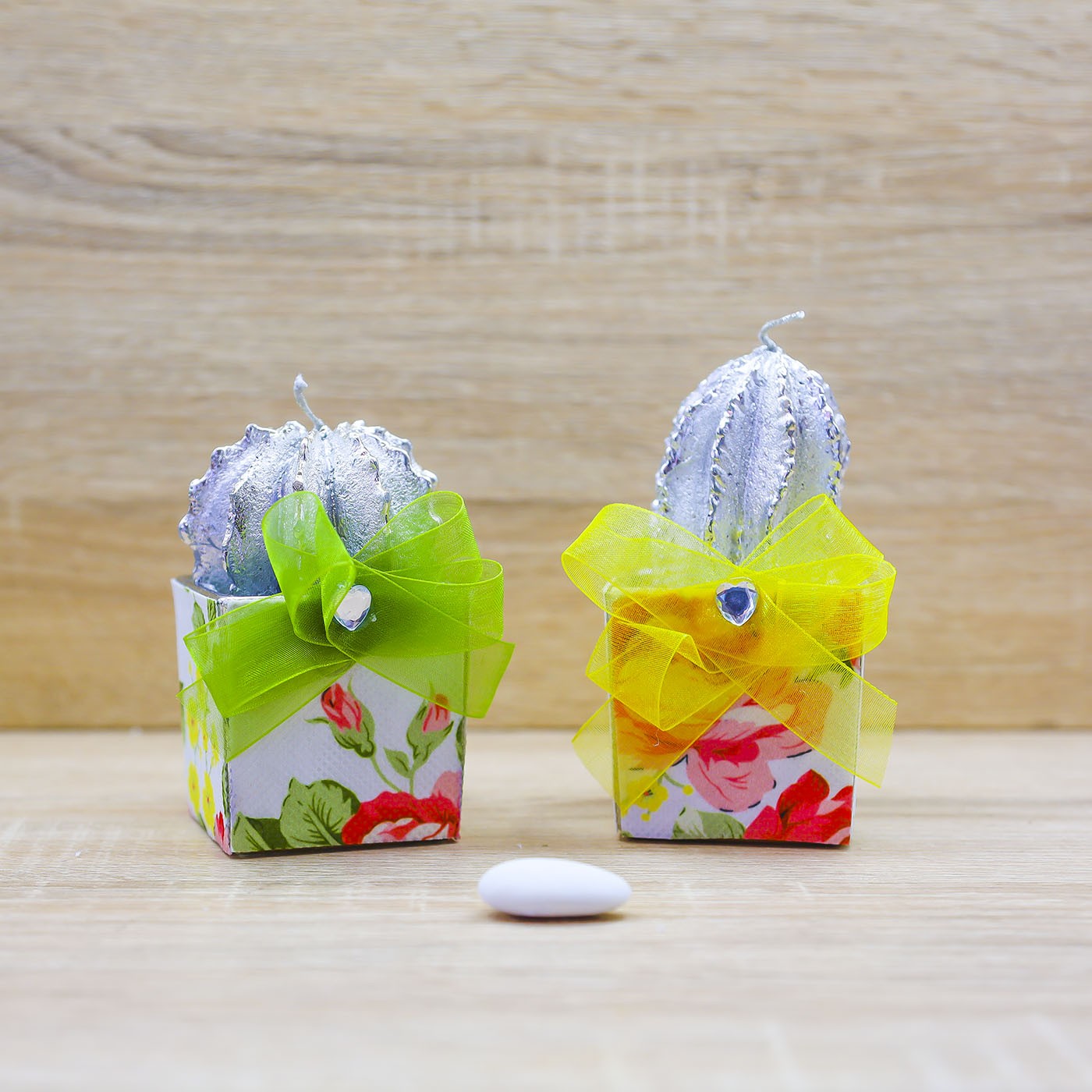 Candela a forma di Pianta di Cactus, tessuto decorato con rose , triplo fiocco giallo e verde e applicazione di un cuoricino.