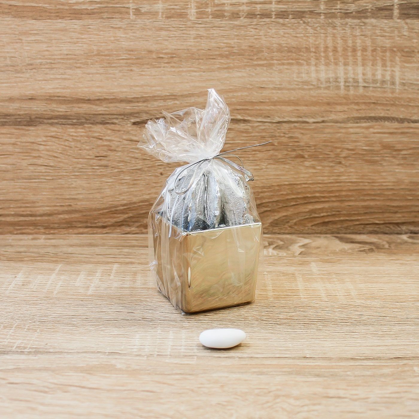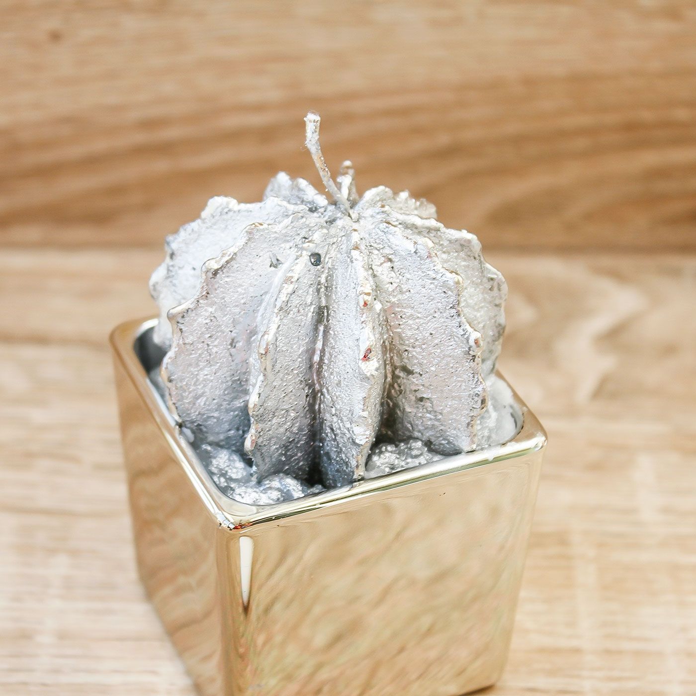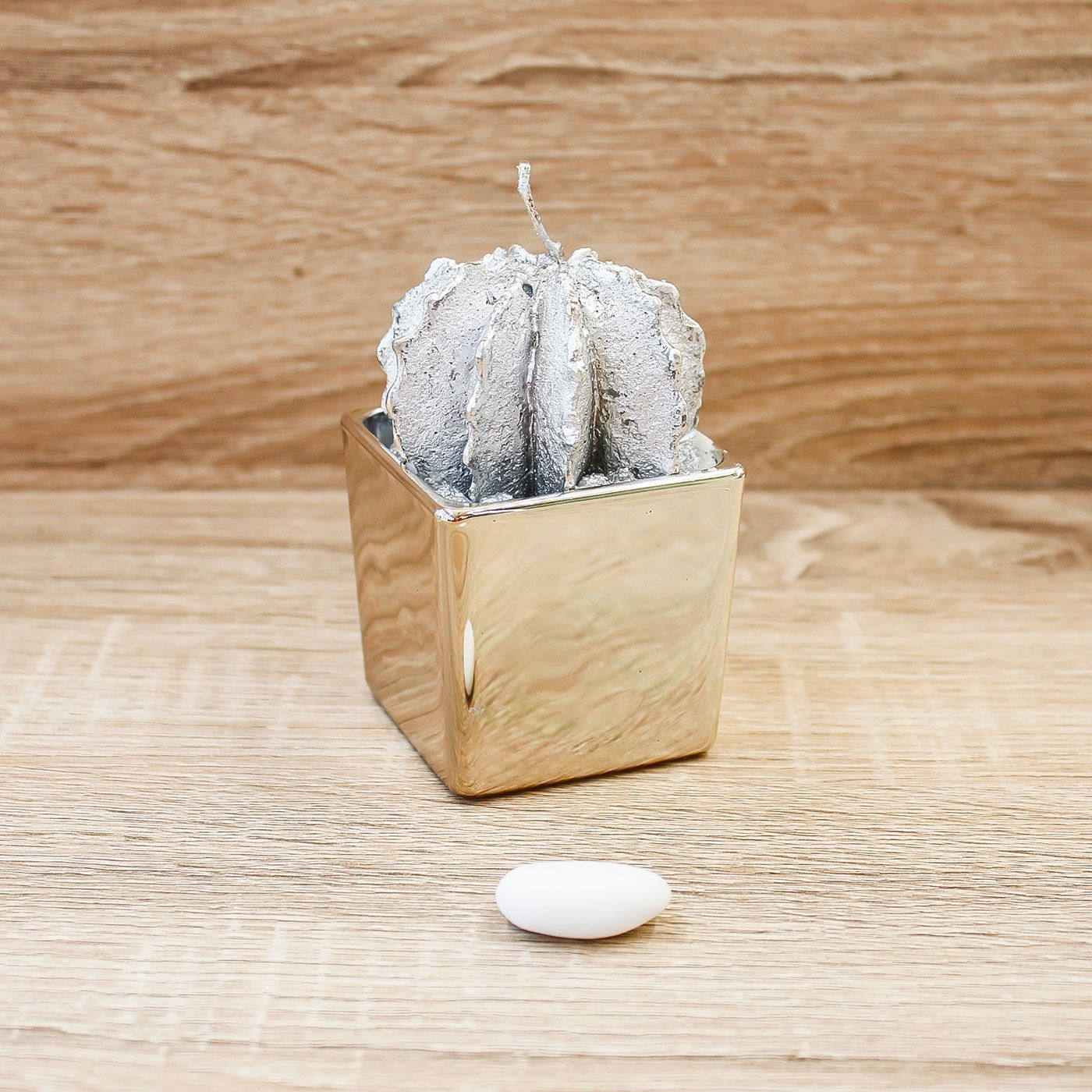 Portacandele in Metallo dal colore argento specchiato con candela a forma di cactus.
