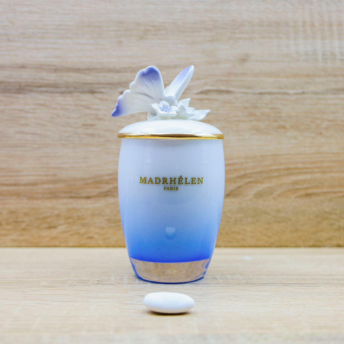Candela Profumata in vetro dai colori vibranti che sfumano da celeste al bianco, tappo in porcellana con una farfalla e dei fiorellini che donano alla candela un tocco di romanticismo, firmato Madrhèlen.