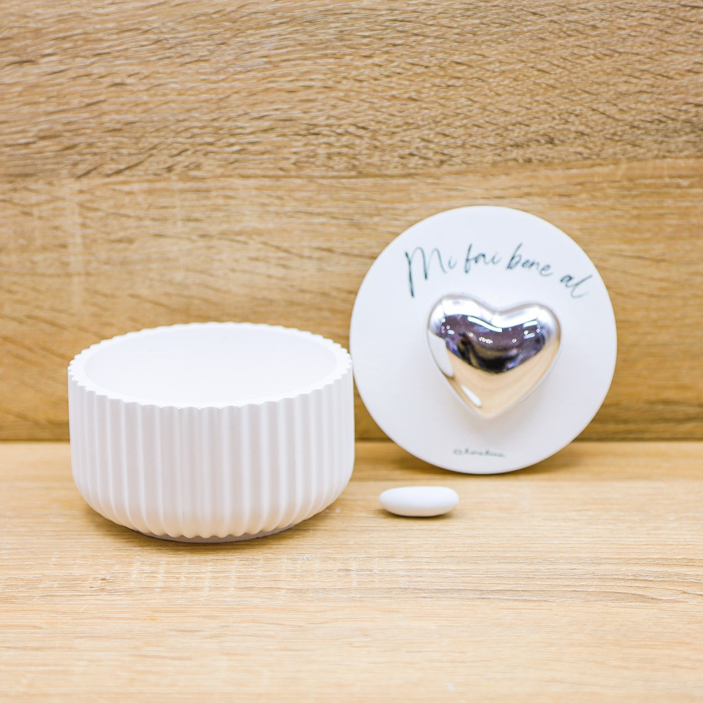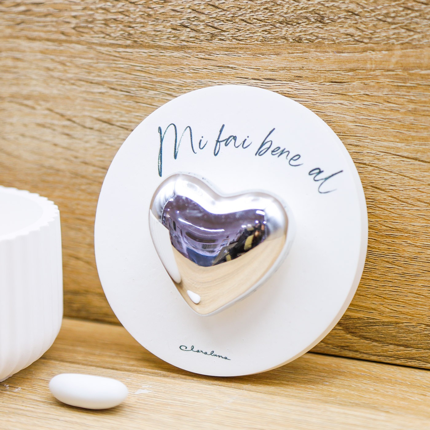 Scatola con candela profumata alla vaniglia, tappo con scritta "Mi fai bene al..." e applicazione di un cuore di colore argento, firmato Claraluna.