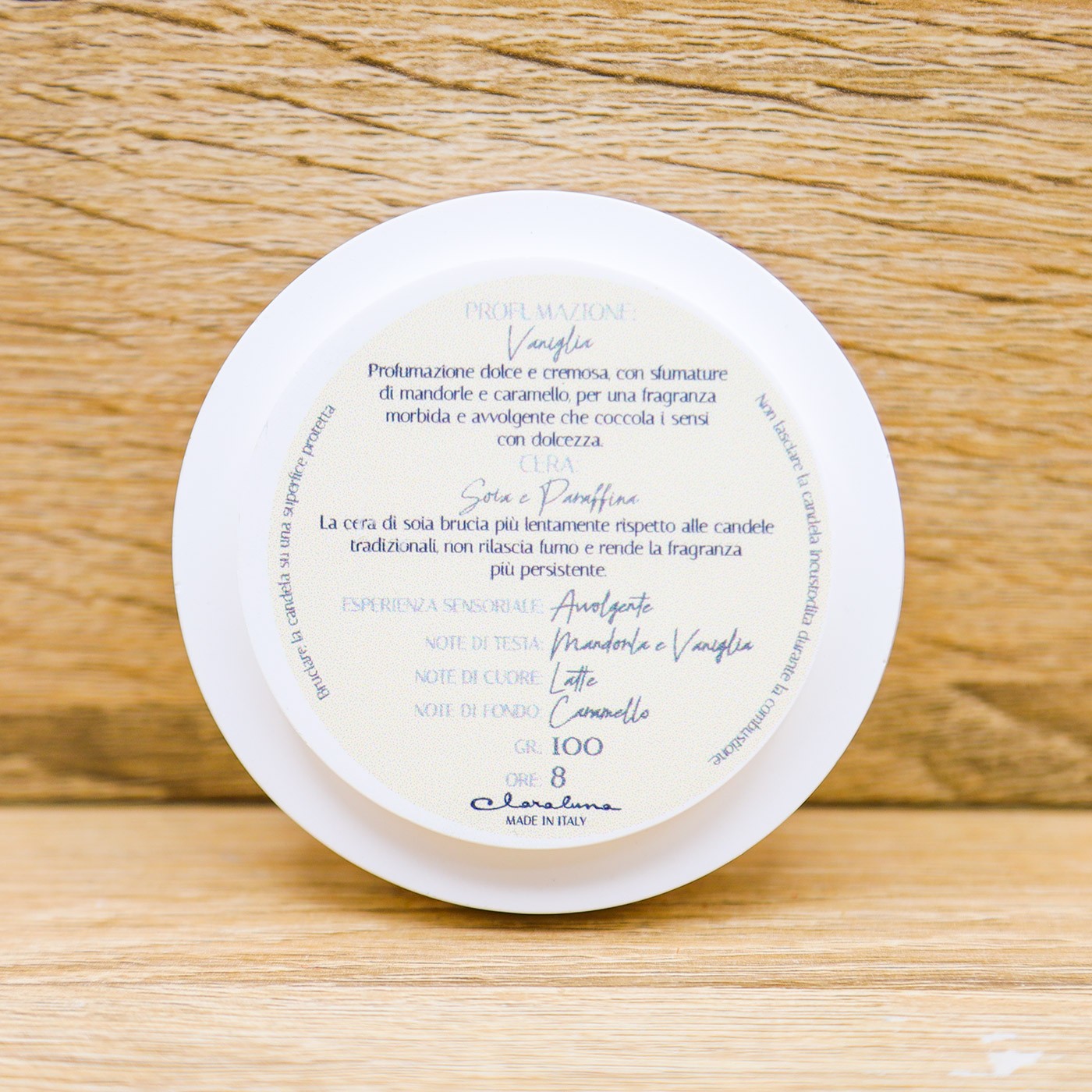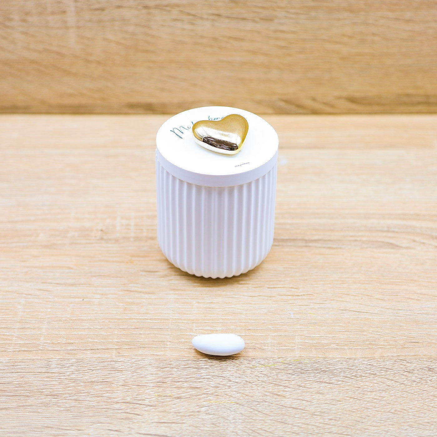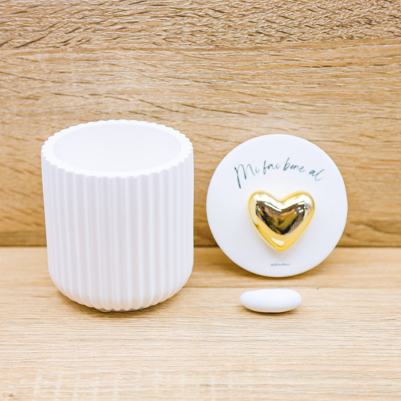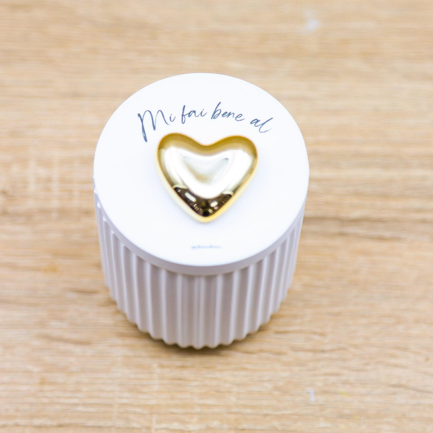 Scatola con candela profumata alla vaniglia, tappo con scritta "Mi fai bene al..." e applicazione di un cuore di colore oro, firmato Claraluna.