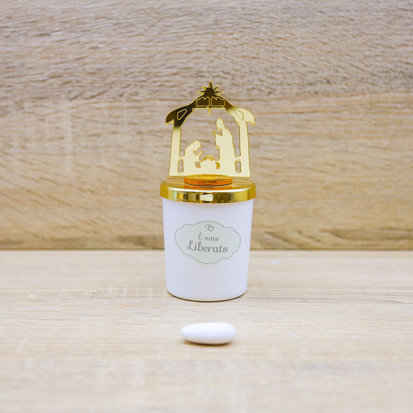 Candela bianca con scritta "è nato" personalizzata e tappo con Sacra Famiglia in plex color oro specchiato.