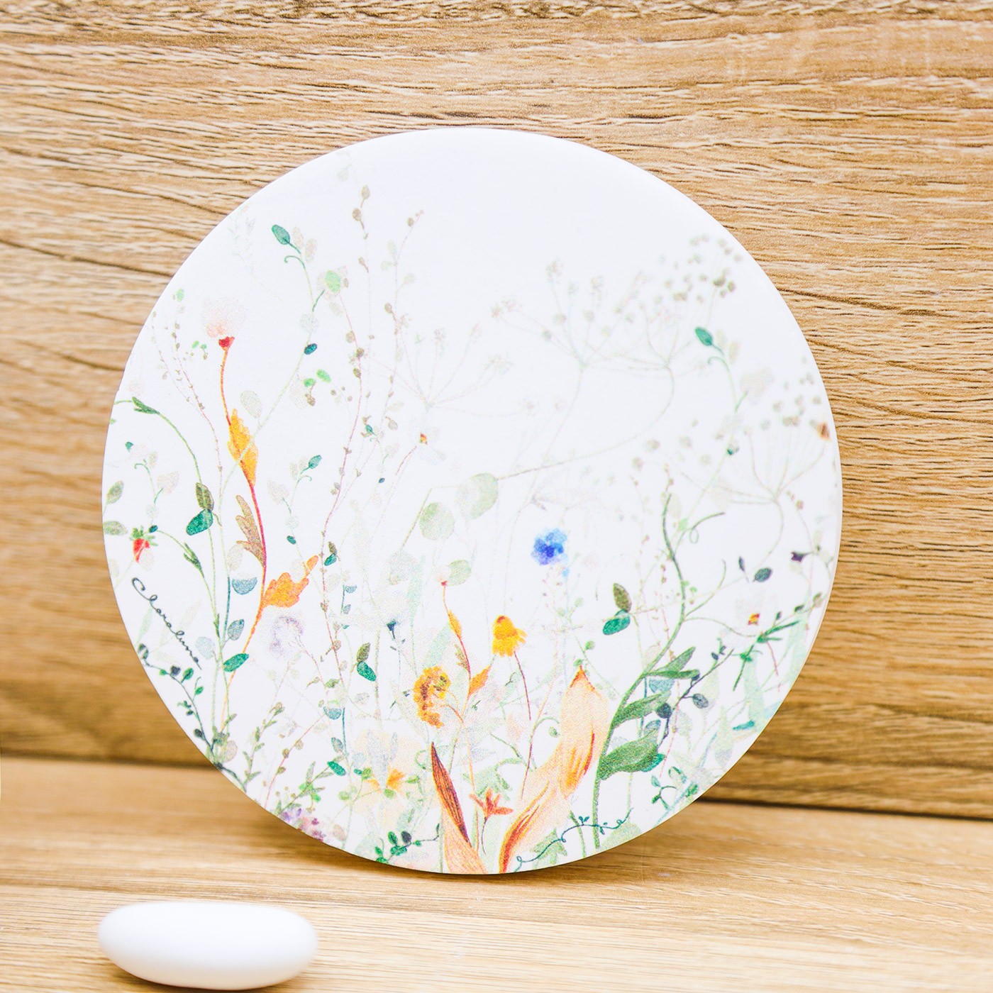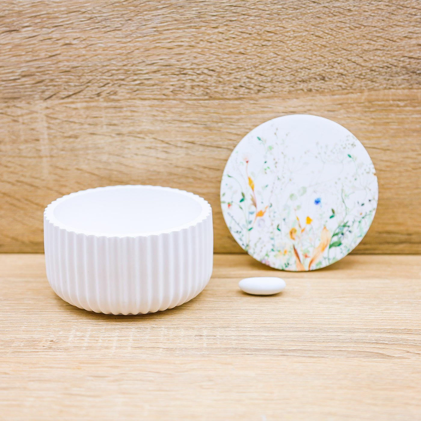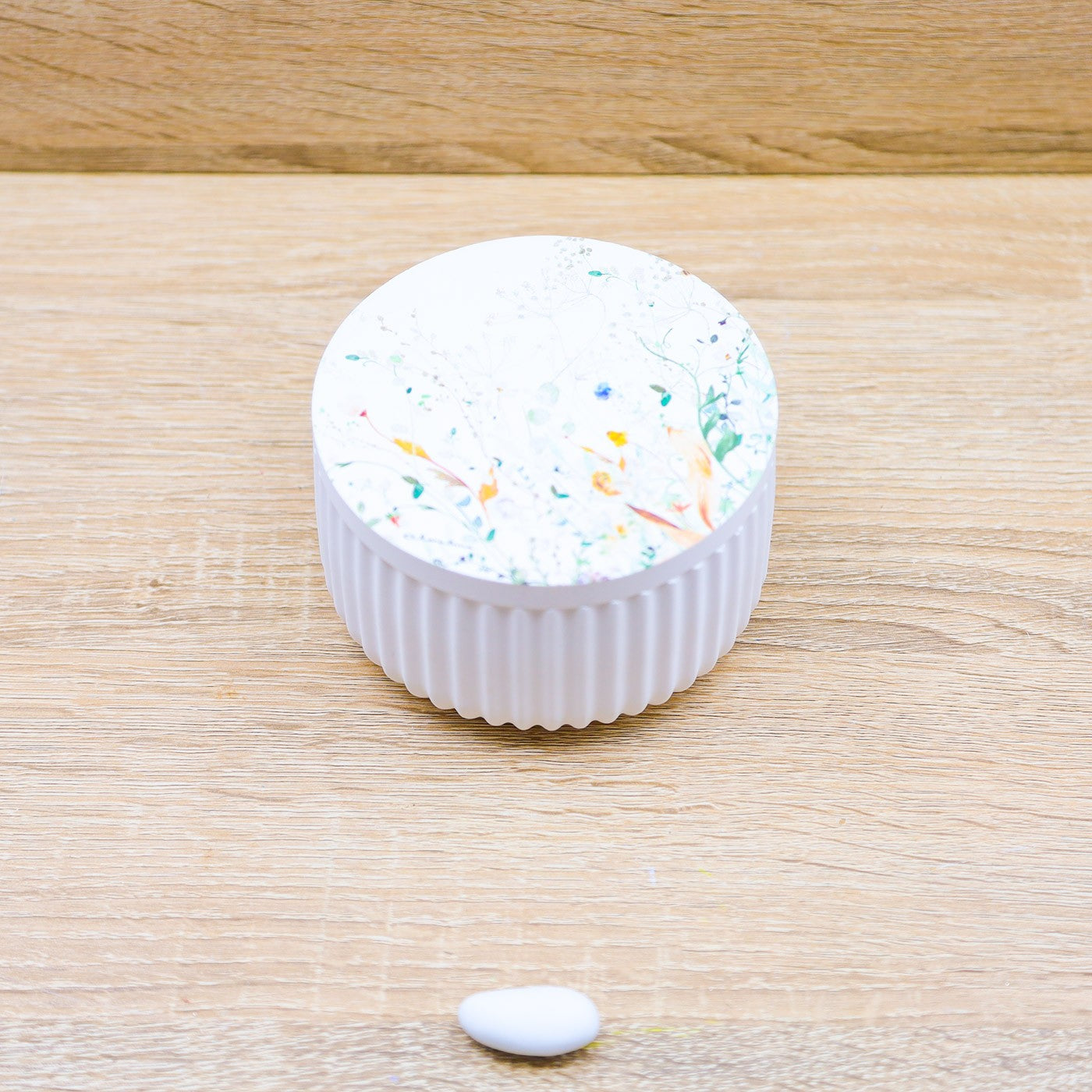 Scatola con candela profumata alla vaniglia, tappo con decoro di fiori colorati, firmato Claraluna.
