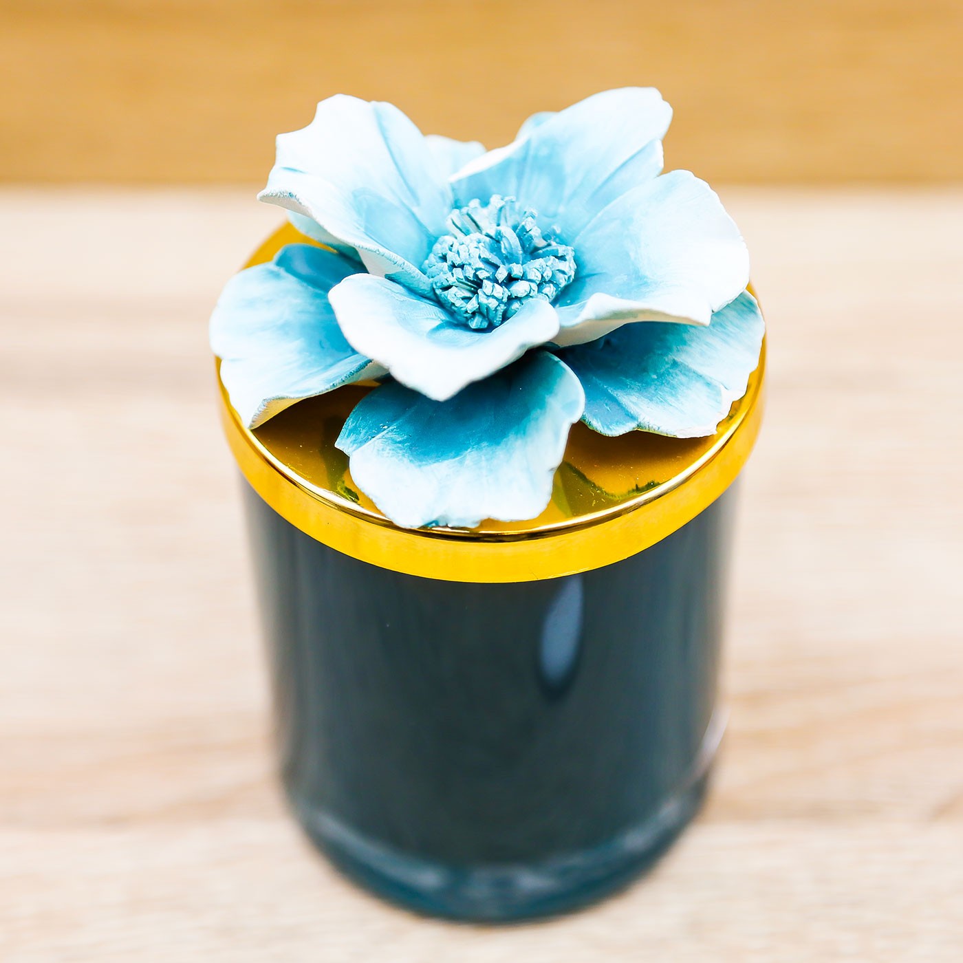 Candela Profumata color verde petrolio, con tappo oro e applicazione di un fiore bianco con sfumature verde petrolio in porcellana, firmato Pienne Design.