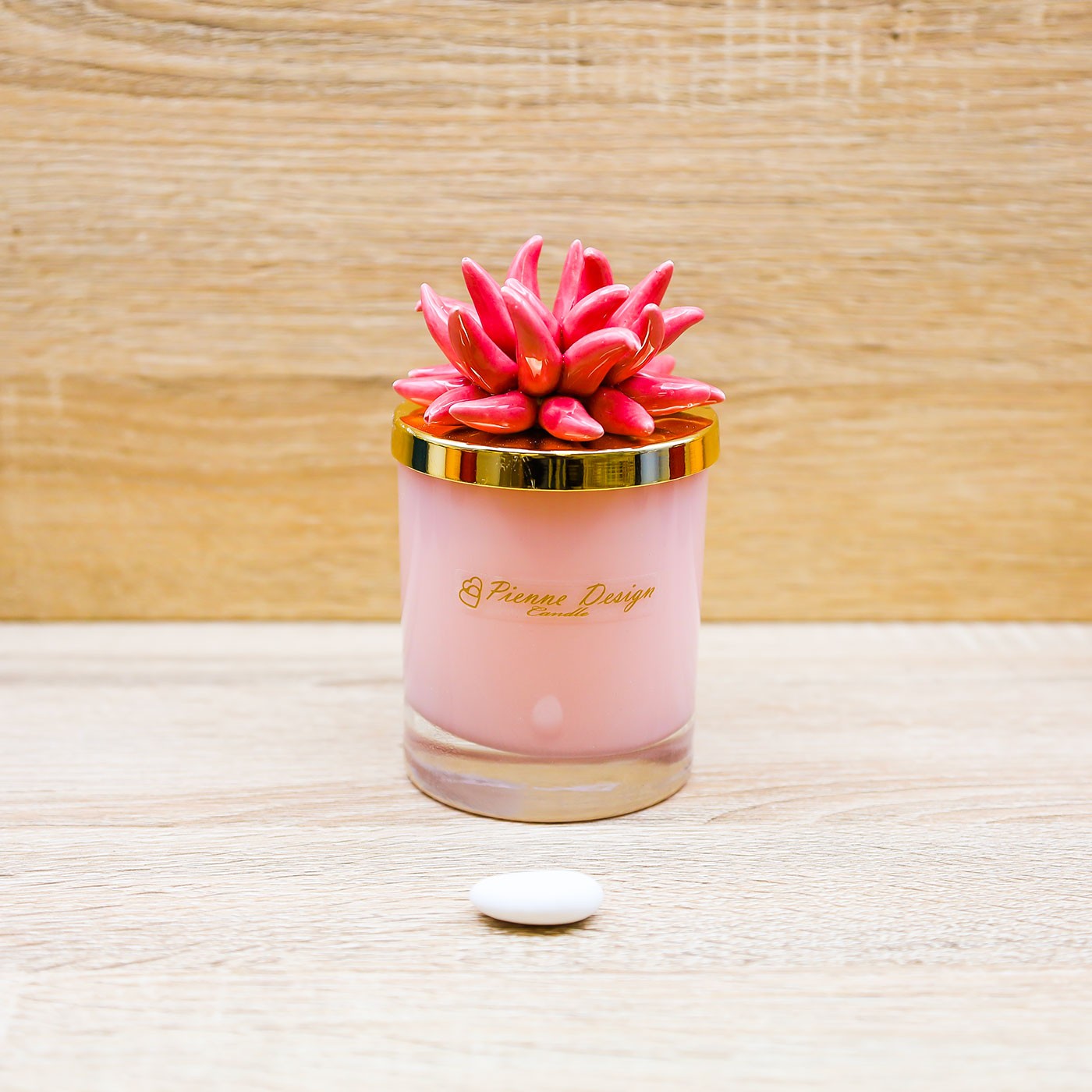 Candela Profumata colore rosa, con tappo oro e applicazione di un riccio rosa in porcellana, firmato Pienne Design.