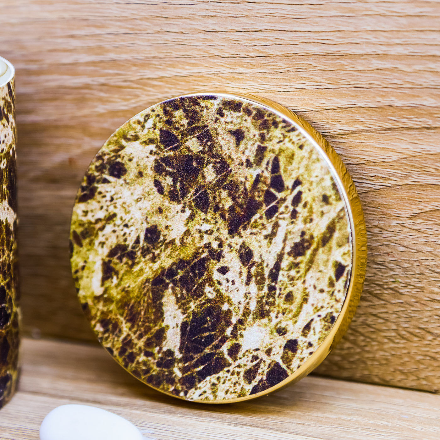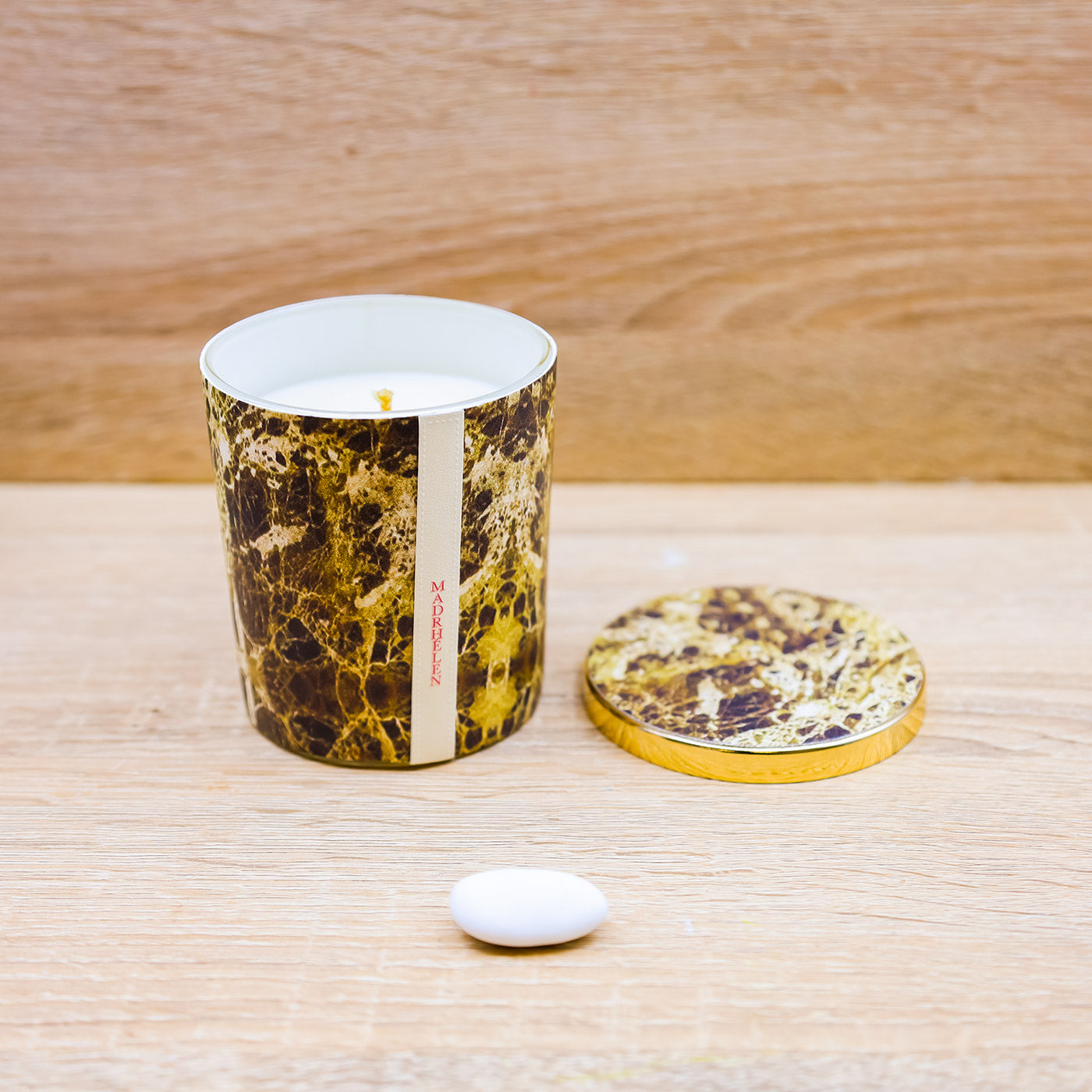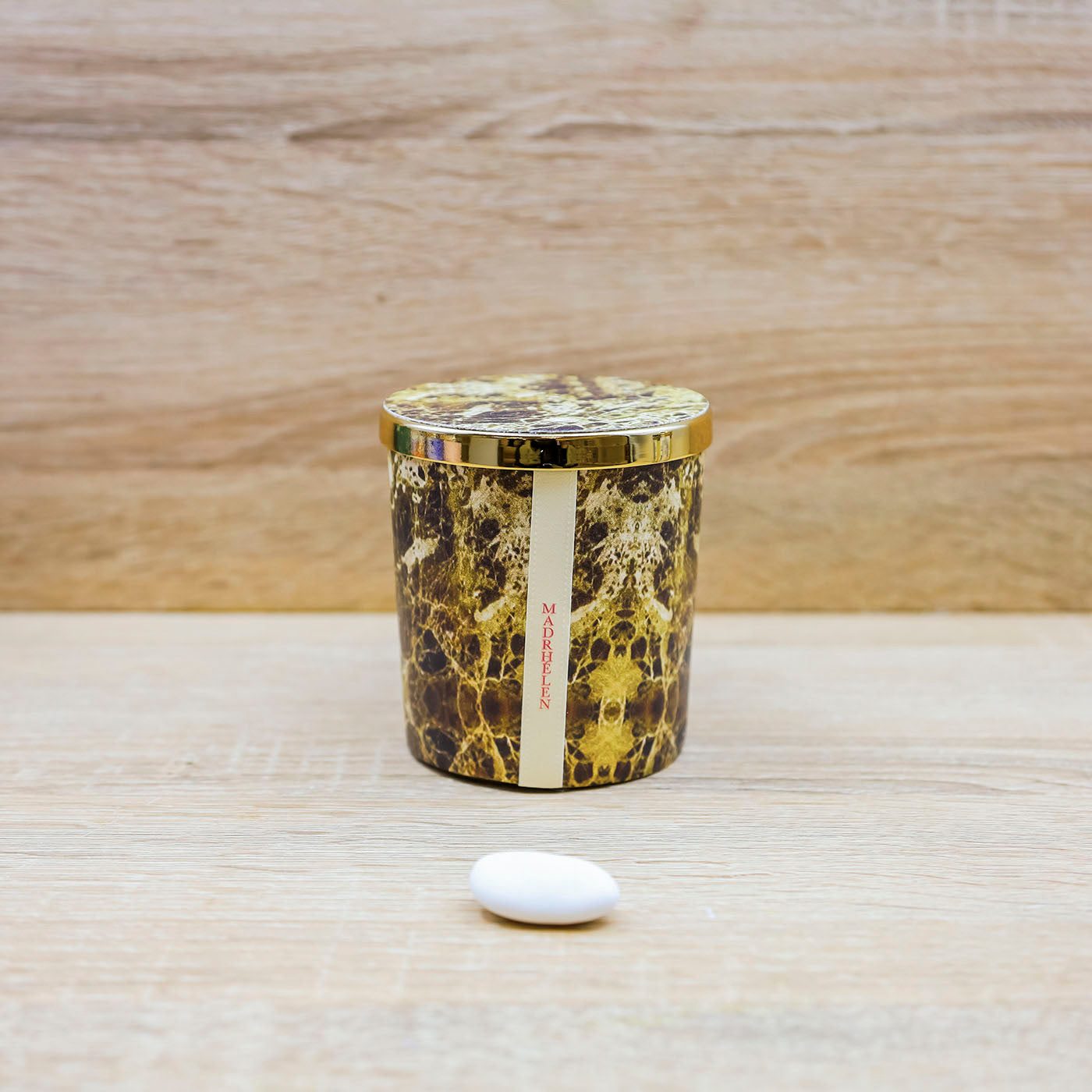 Candela Profumata decorata in stile marmorizzato con sfumature marroni e verdi e tappo oro che riporta lo stesso decoro della candela, firmato Madrhèlen.
