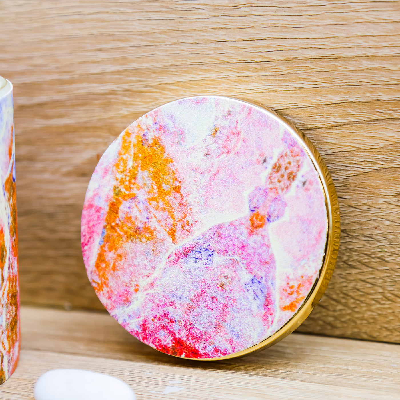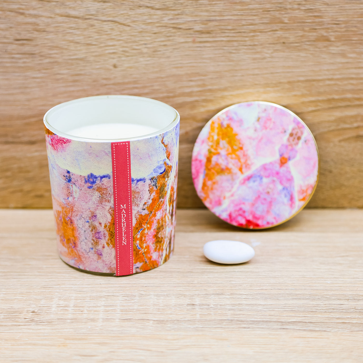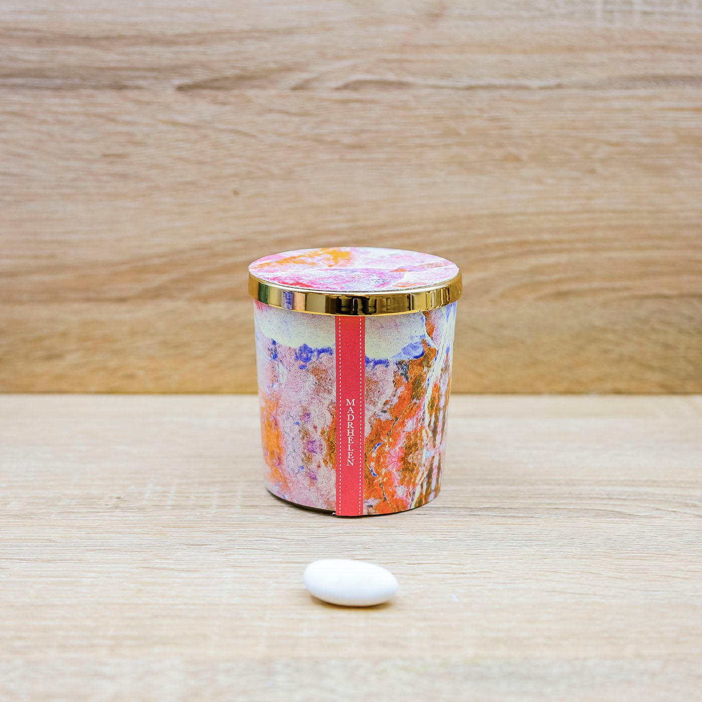 Candela Profumata decorata in stile marmorizzato con sfumature multicolor e tappo oro che riporta lo stesso decoro della candela, firmato Madrhèlen.