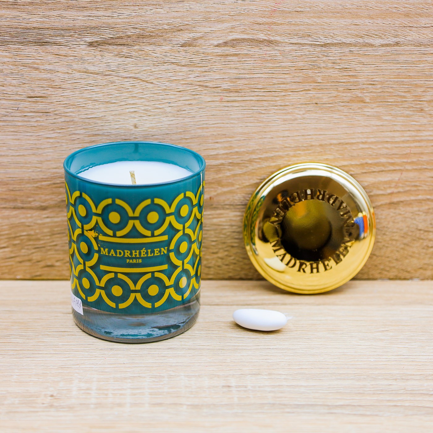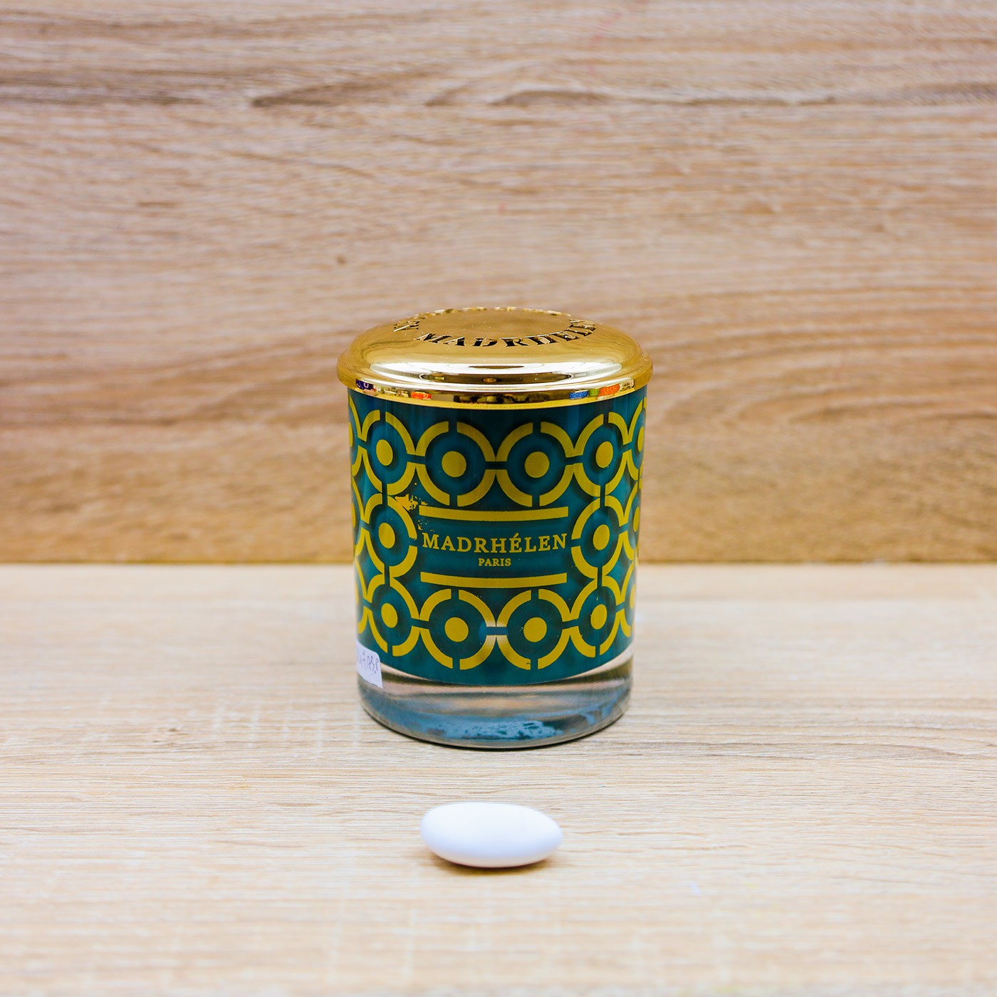 Candela Profumata di colore ottanio decorata in stile pop con cerchi di colore oro e tappo oro firmato Madrhèlen.