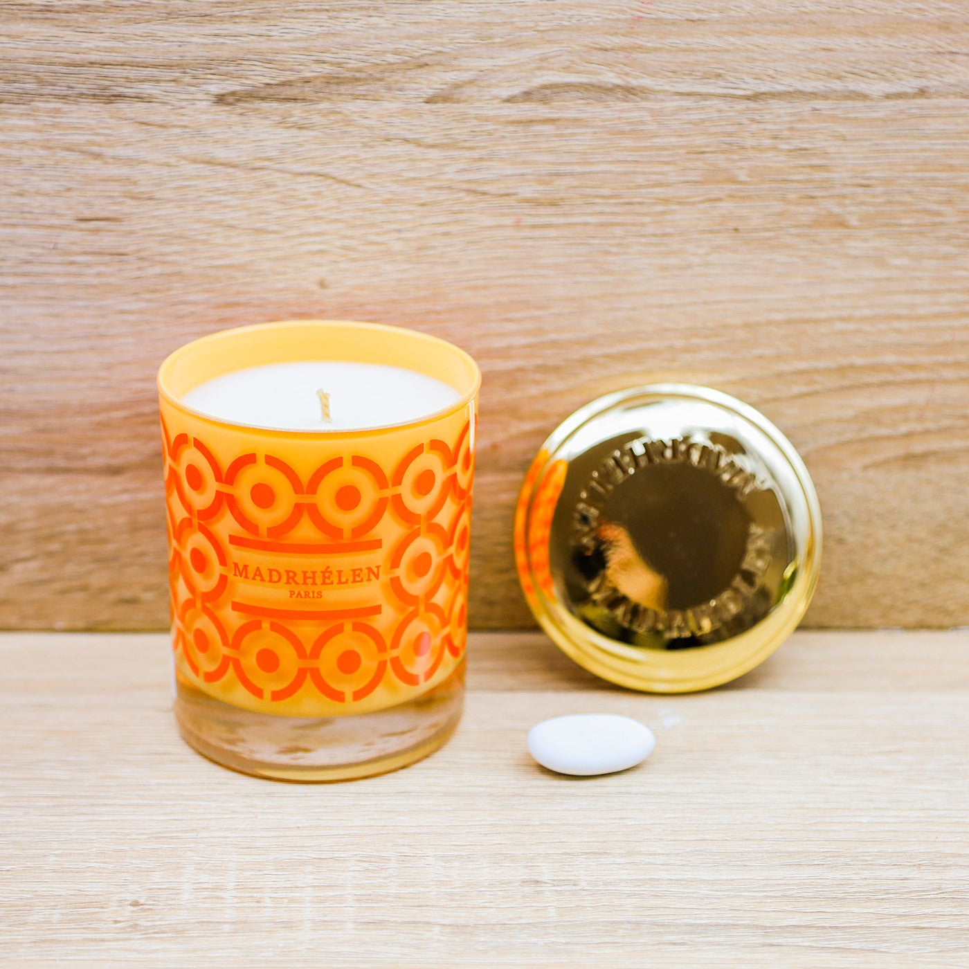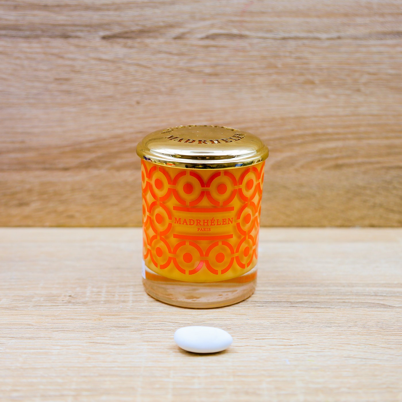 Candela Profumata di colore pesca decorata in stile pop con serigrafie di cerchi arancio e tappo oro firmato Madrhèlen.