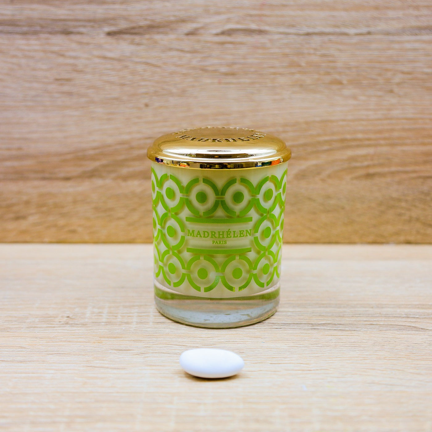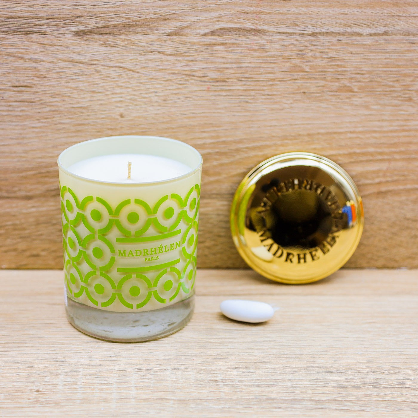Candela Profumata decorata in stile pop con serigrafie di cerchi verdi e tappo oro firmato Madrhèlen.