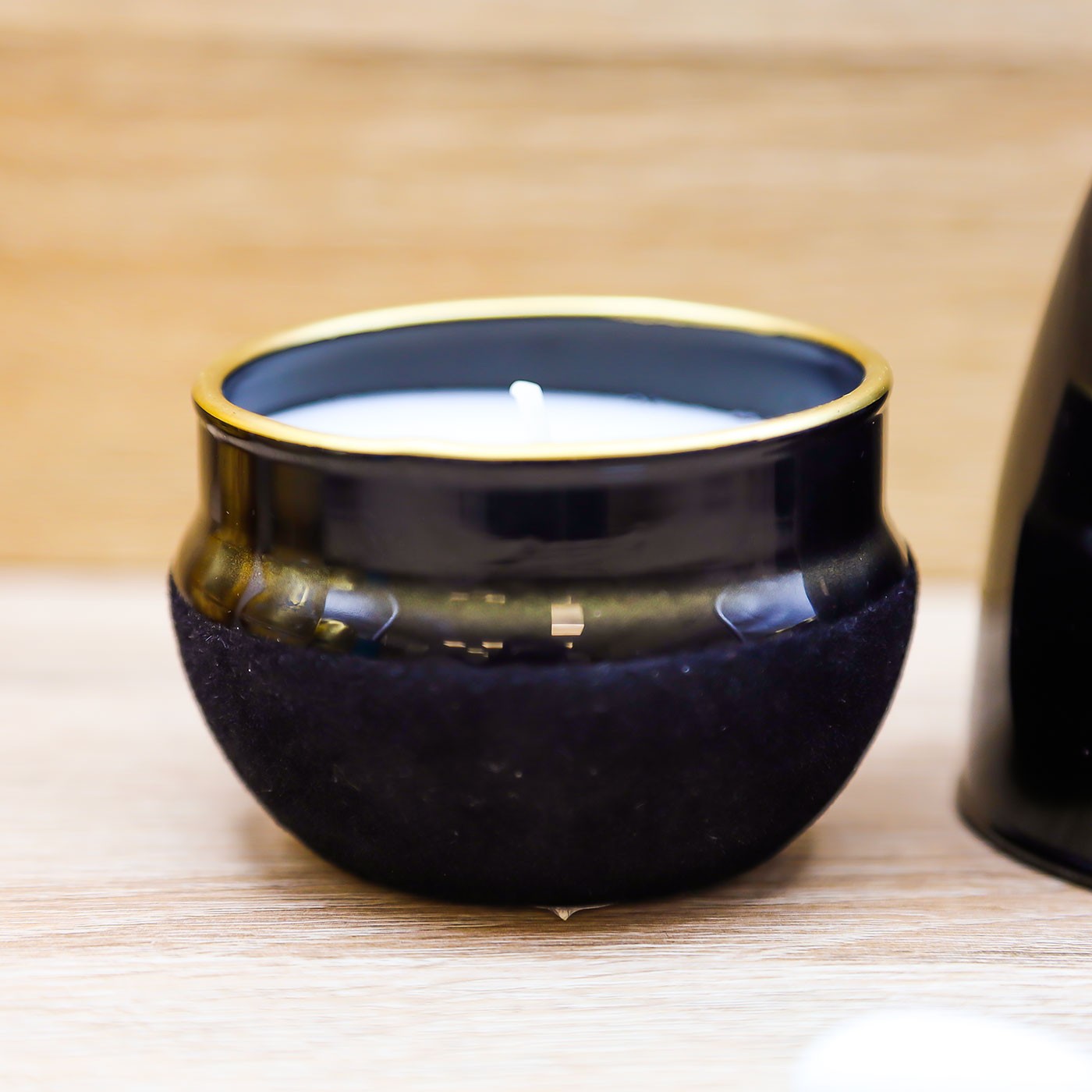 Elegante Candela Profumata in vetro di colore nera con base in velluto, firmato Tom Ch London.