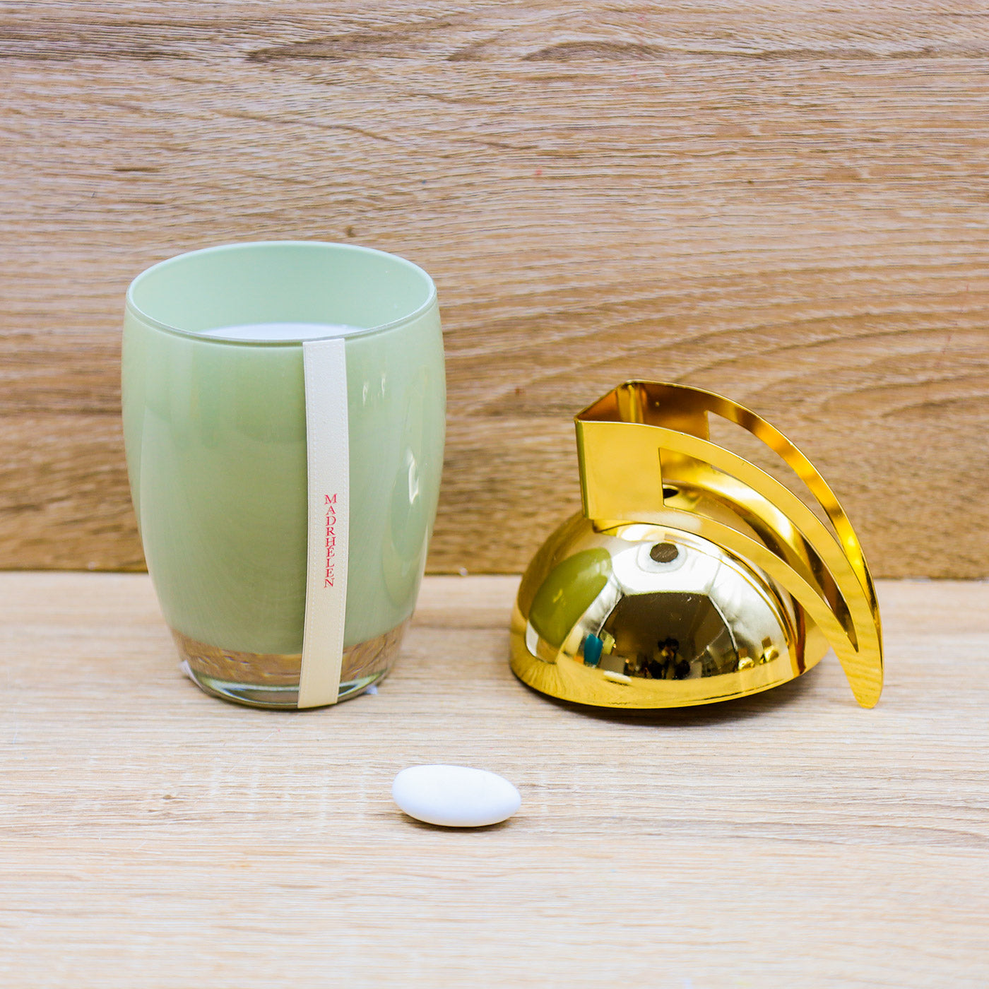 Elegante candela profumata di colore verde con tappo dalle linee raffinate, firmato Madrhèlen.
