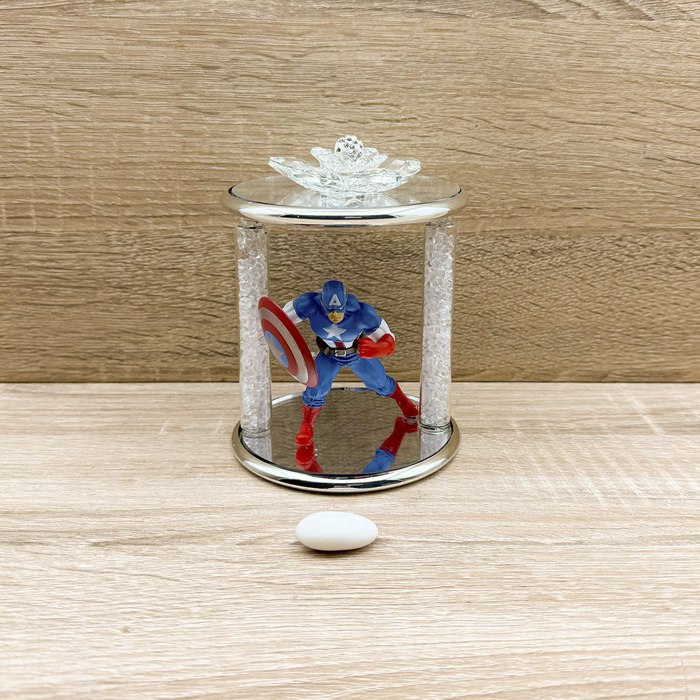 Captain America con base di colore argento, petali di cristallo e cristallini bianchi.