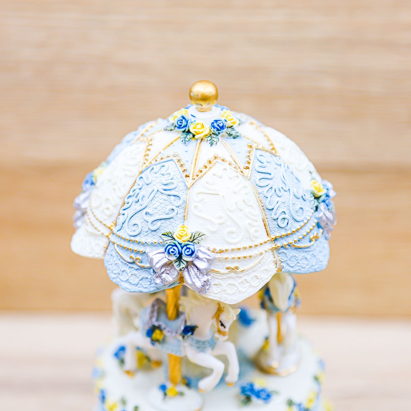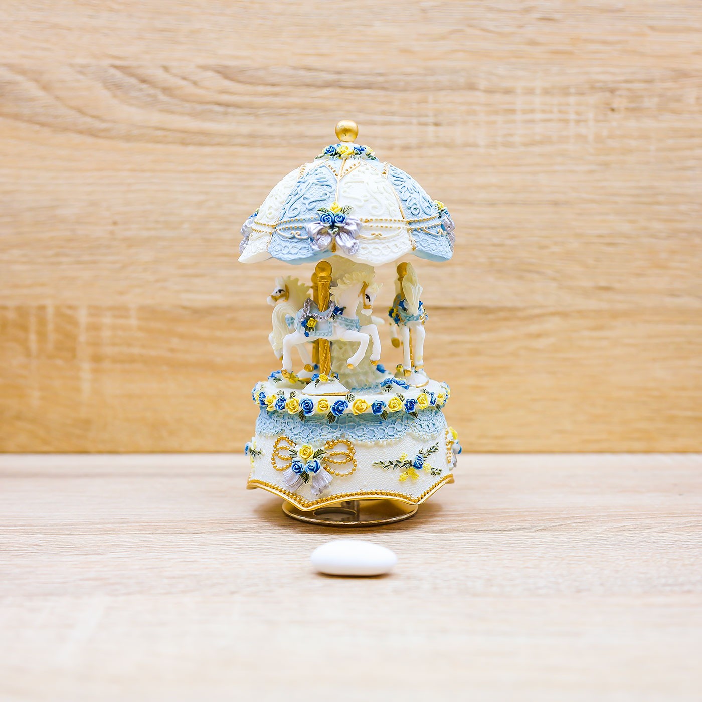Carillon di una giostra con cavalli, decorato con fiorellini azzurri e gialli, fiocchetti e rifinito nei minimi dettaglia, firmato Encantada.