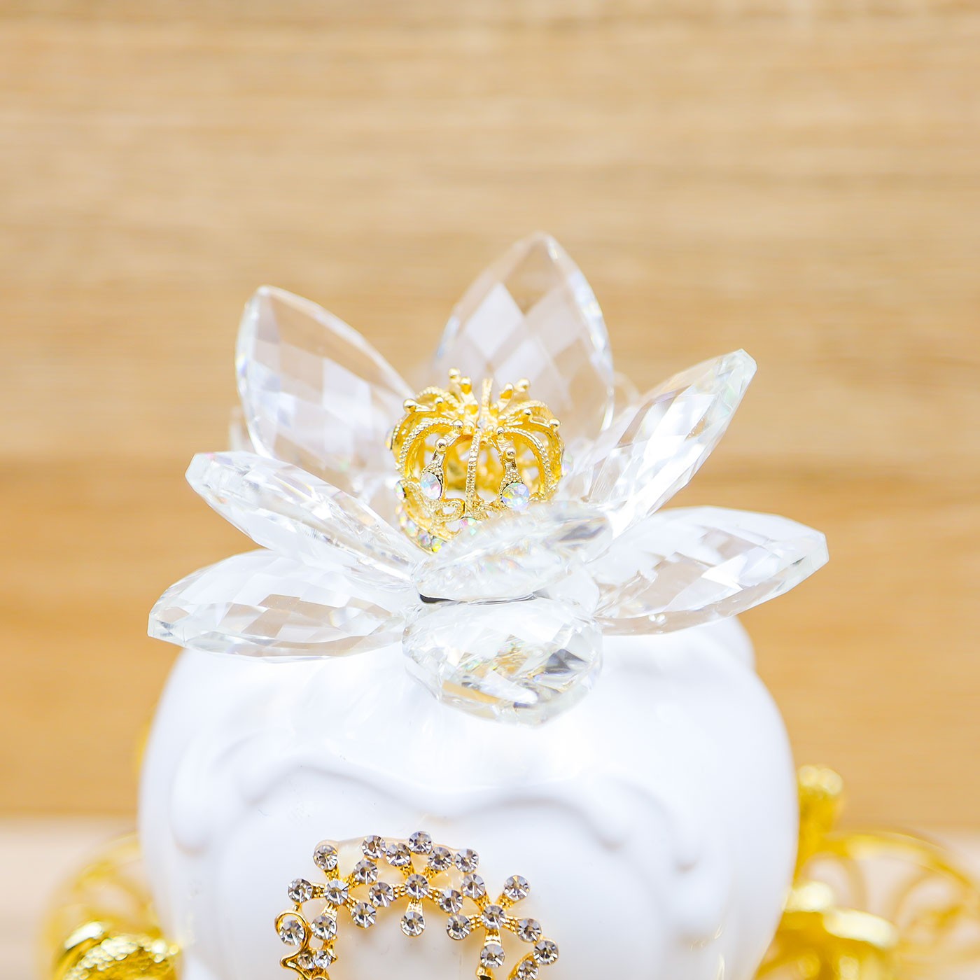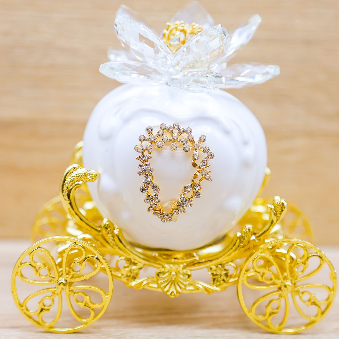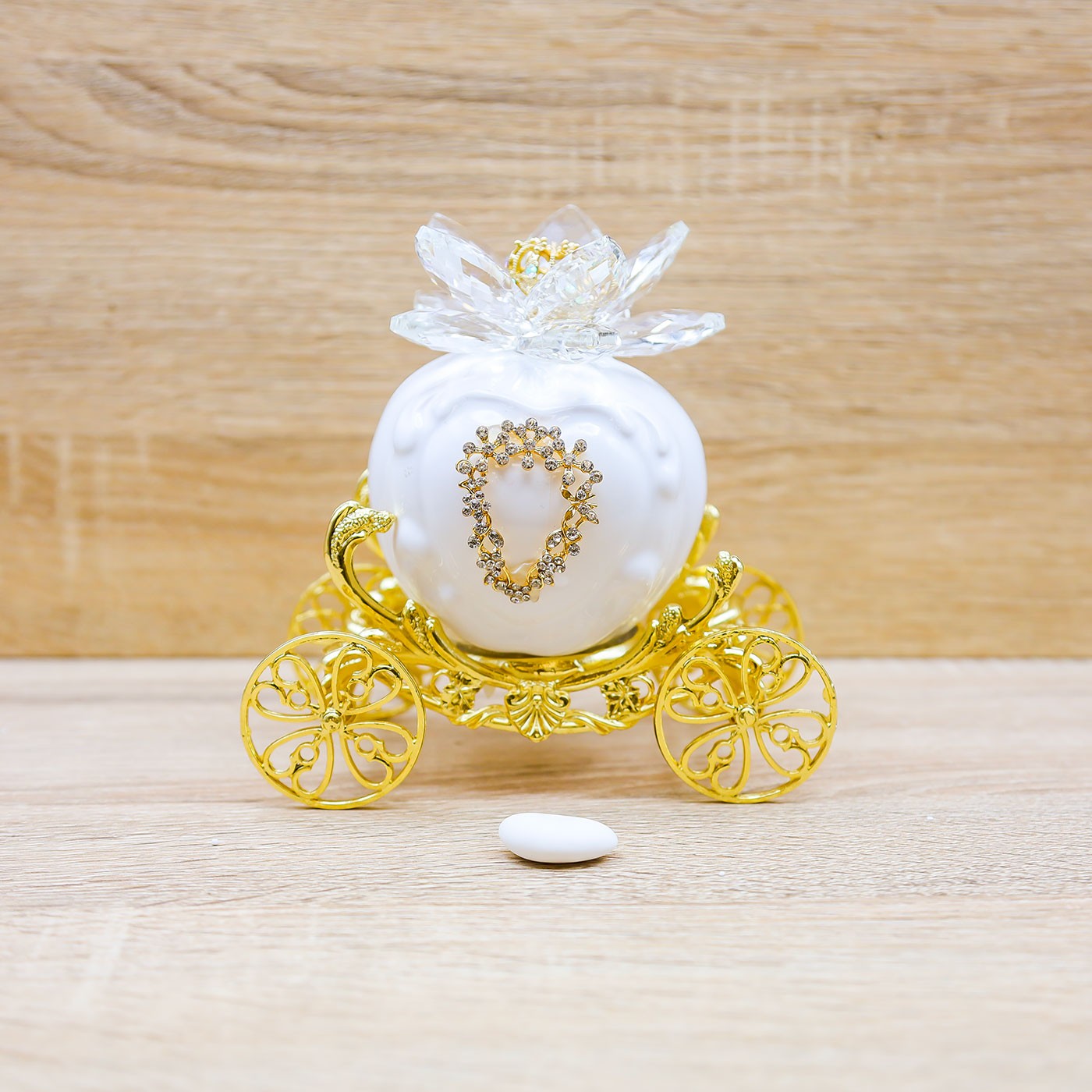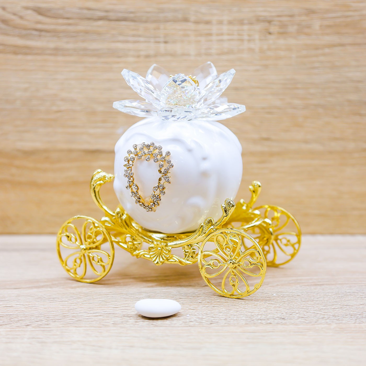 Carrozza in porcellana con petali di cristallo, corona oro ricoperta di strass, base e ruote in metallo dorato, applicazione di strass oro, firmato Marilyn Rome.