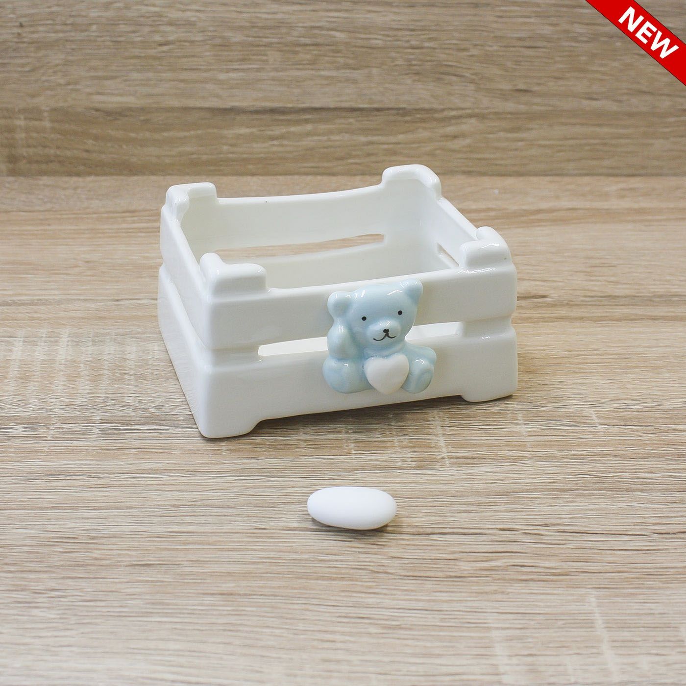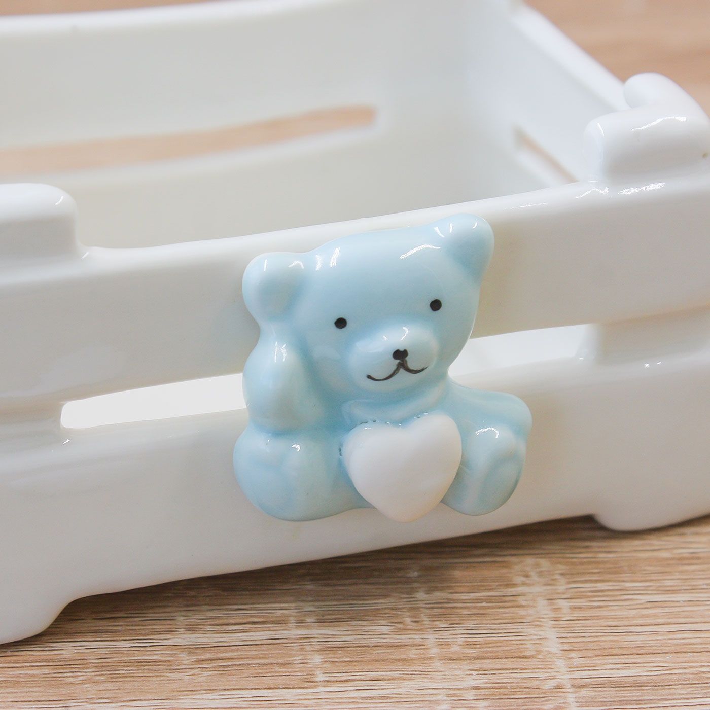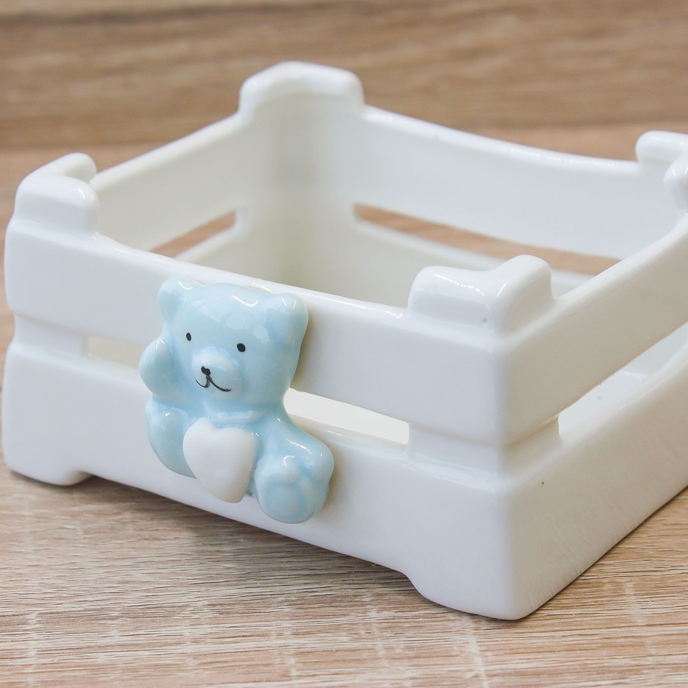 Cassetta in Porcellana con Orsetto Celeste che tra le zampe ha un cuore bianco.