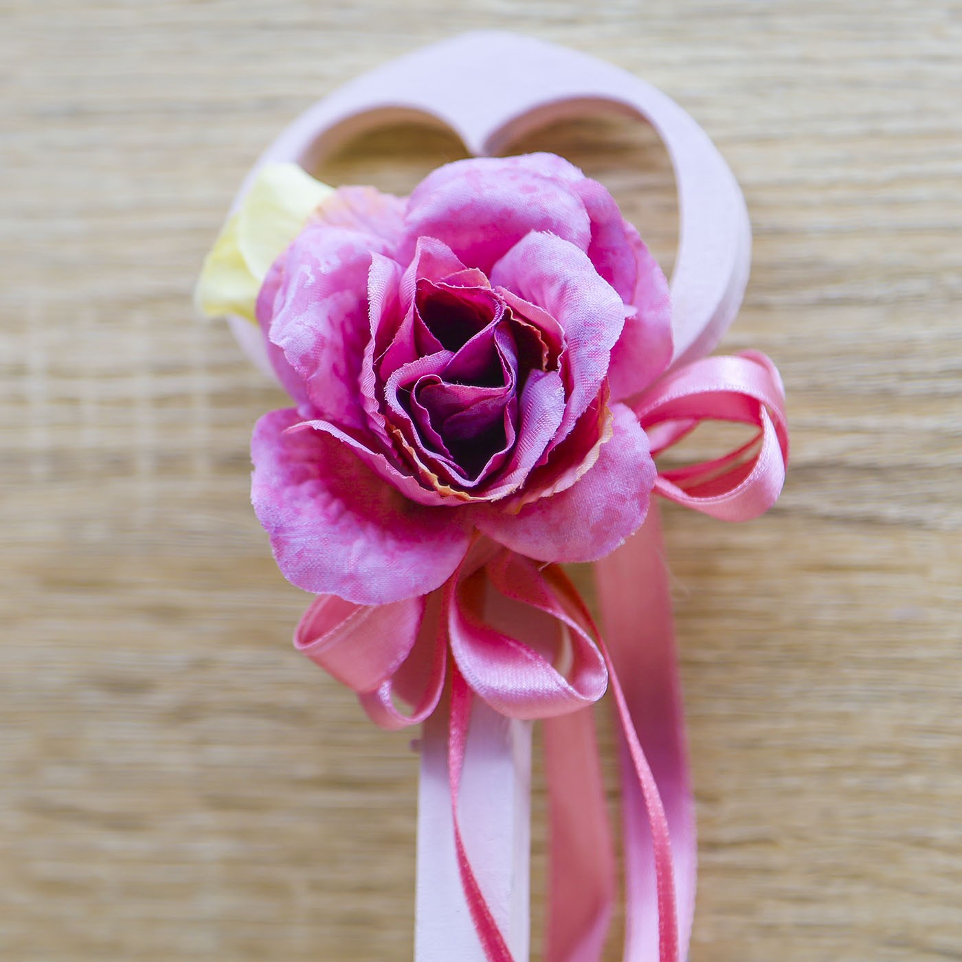 Chiave Portafortuna in legno, dipinta a mano nel colore rosa con applicazione di fiori e triplo fiocco con nastro rosa, firmato Beccalli for Life.