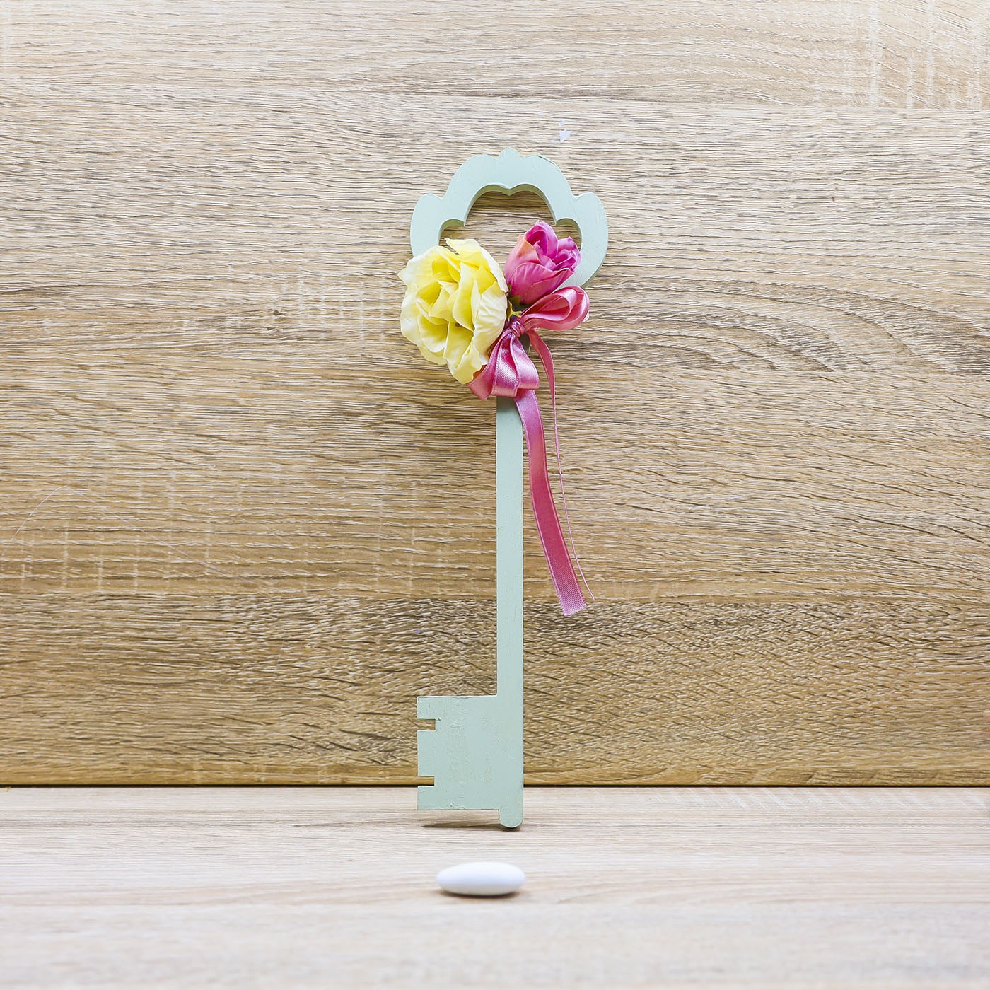 Chiave Portafortuna in legno, dipinta a mano nel colore verde con applicazione di fiori e triplo fiocco con nastro rosa, firmato Beccalli for Life.
