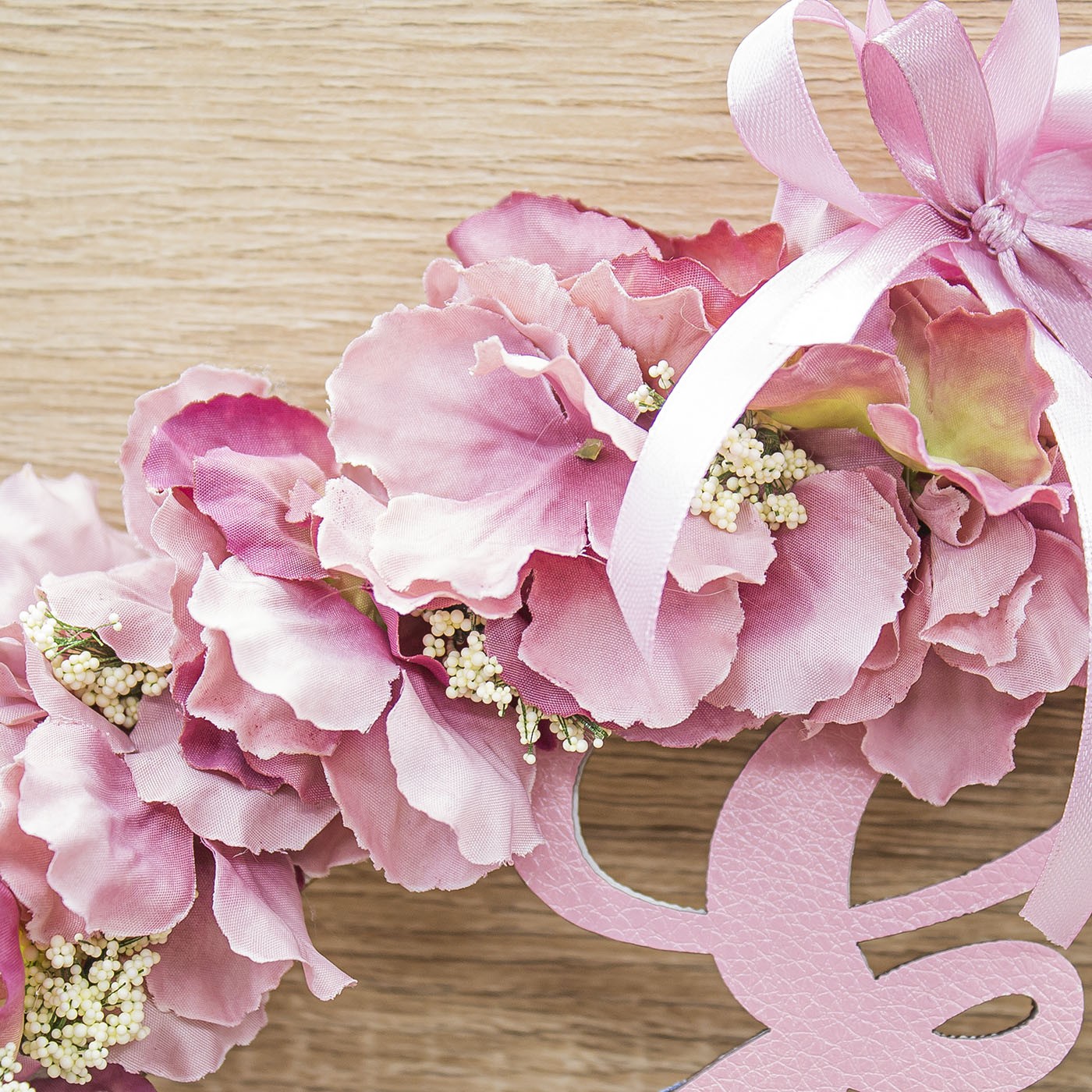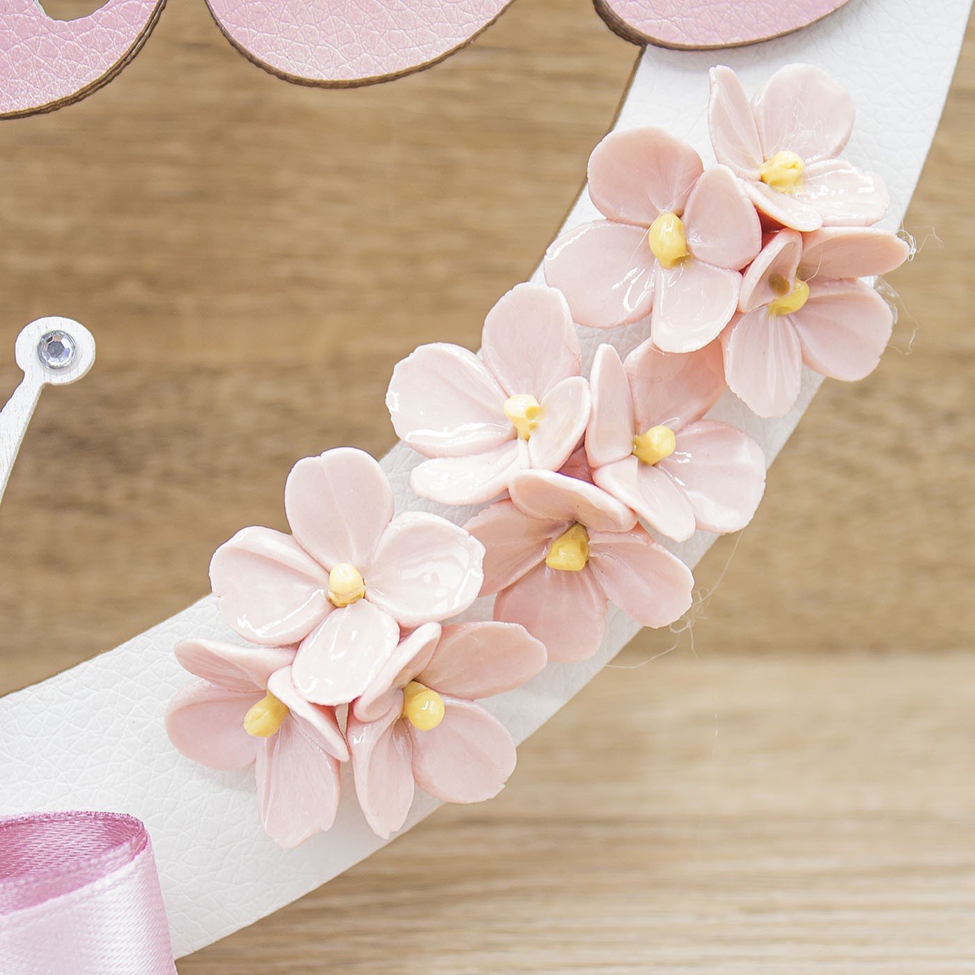 Coccarda in legno con corona, strass e scritta "E' Nato". Doppio Nastro Fucsia e Rosa. Fiorellini in Porcellana di Capodimonte.