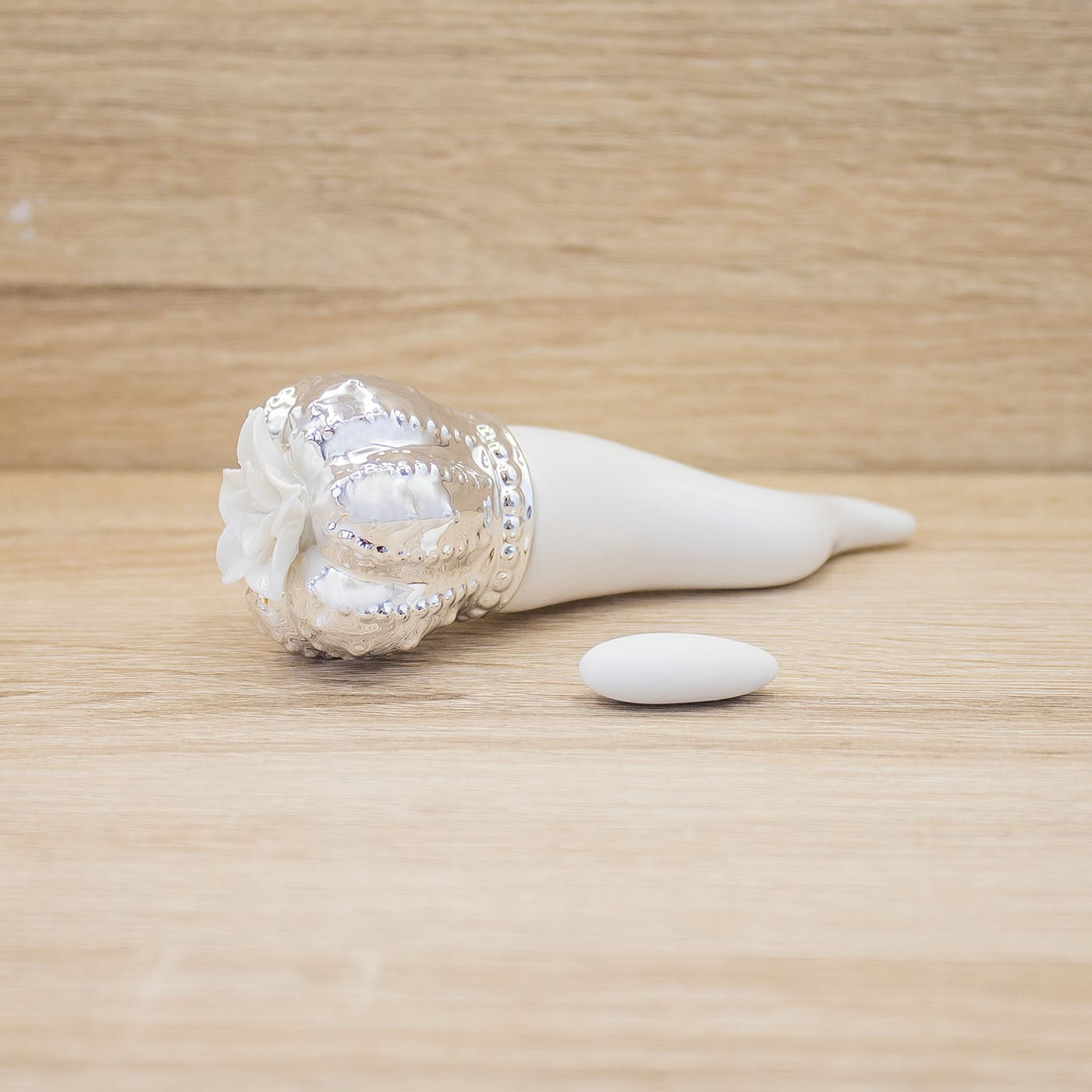 Corno portafortuna bianco con decori argento lucido e fiore in porcellana di Capodimonte, firmato Mandorle by Paben.
