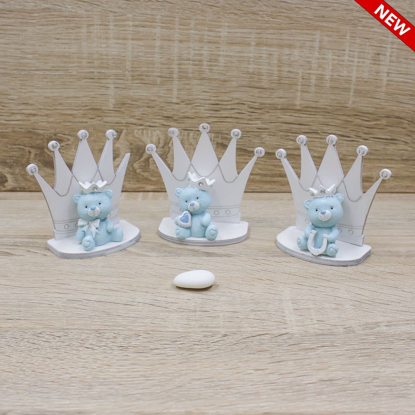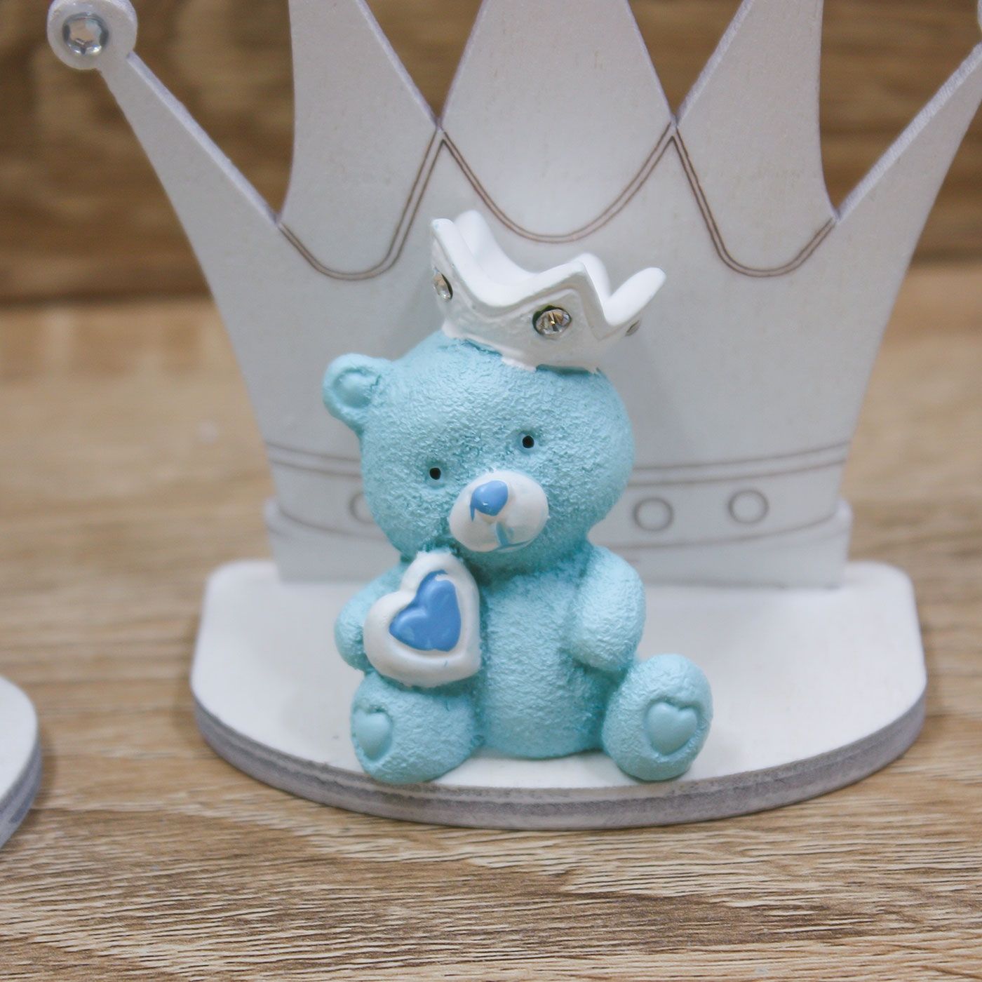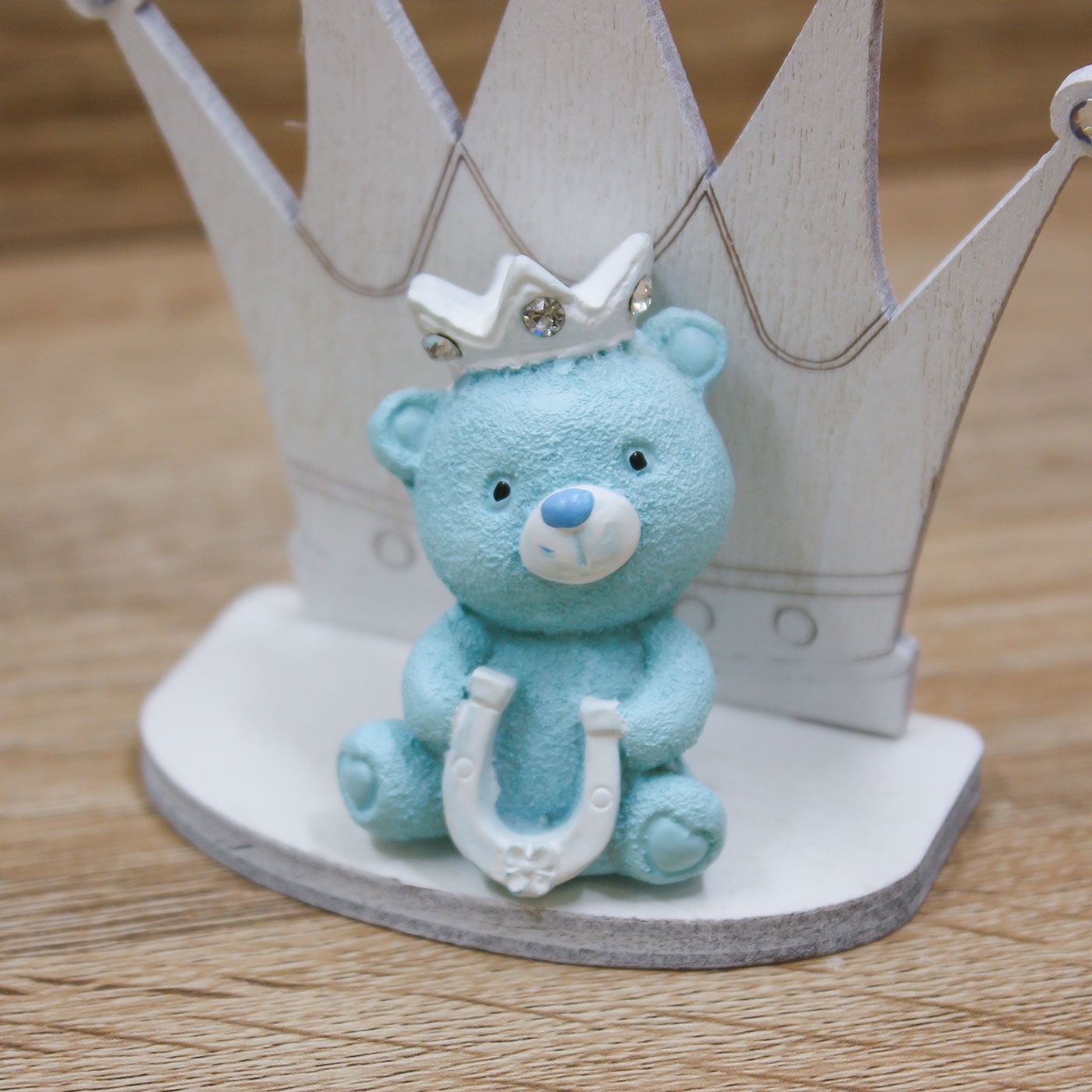 Corona in legno con strass alle punte della corona. Orsetto celeste in resina con coroncina in testa.
