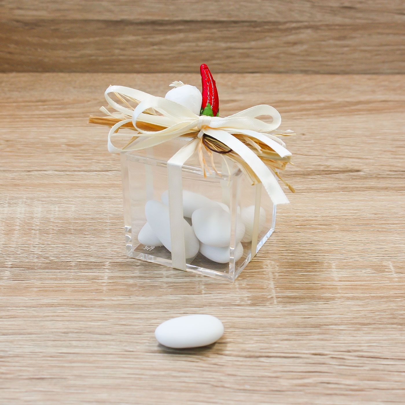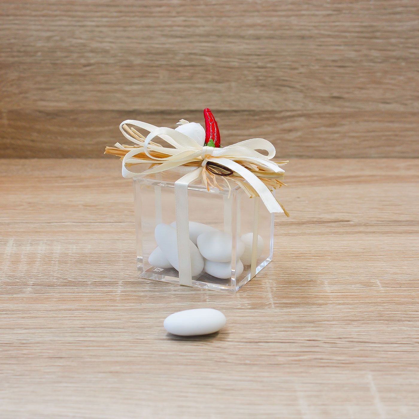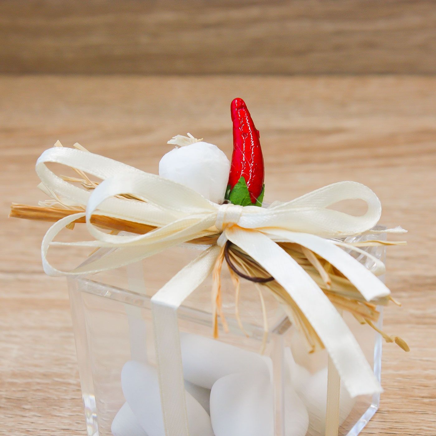 Cubo in Plex in Iuta con rafia, 1 Peperoncino, 1 Aglio, Ciondolo Cornetto Rosso in Metallo e doppio fiocco con raso panna.