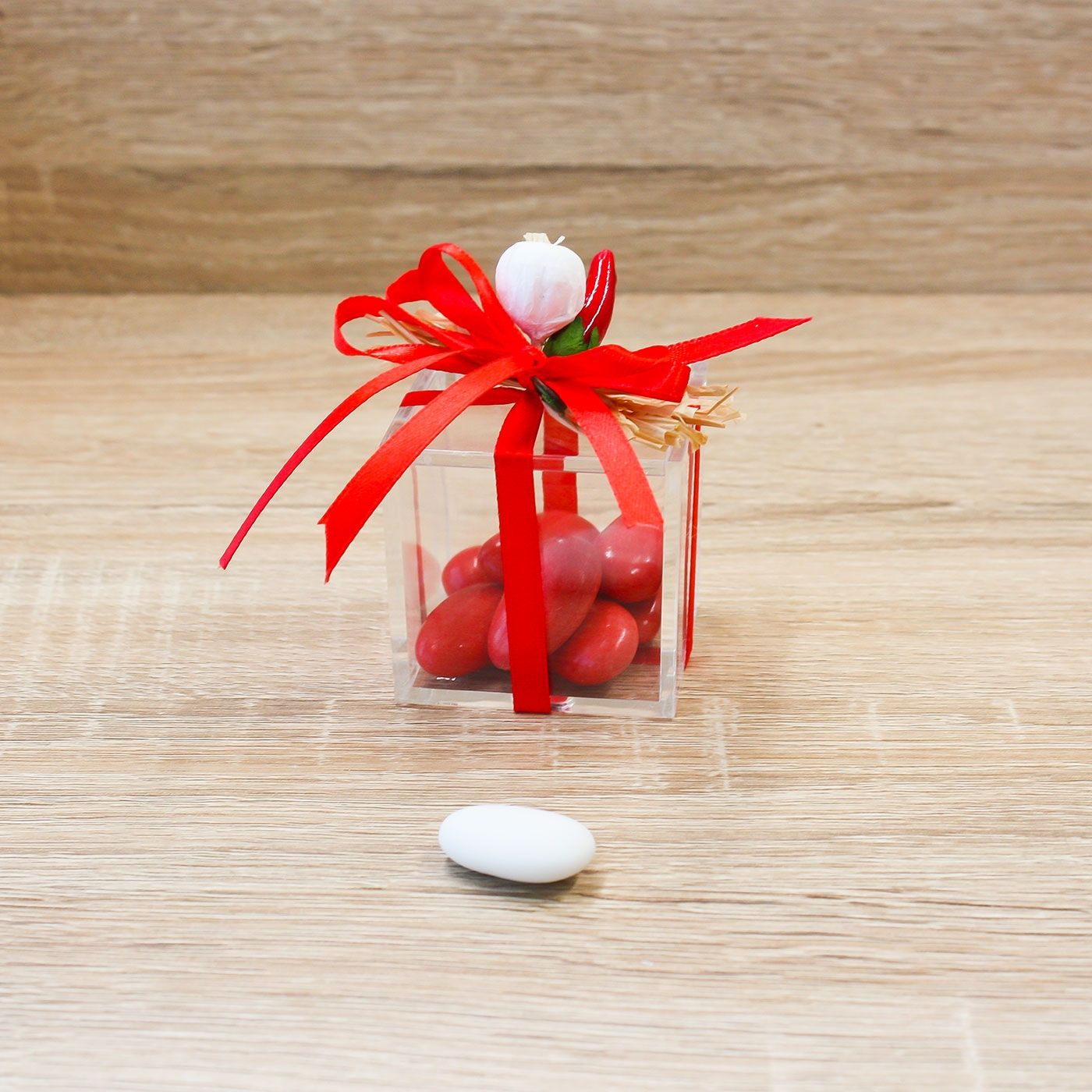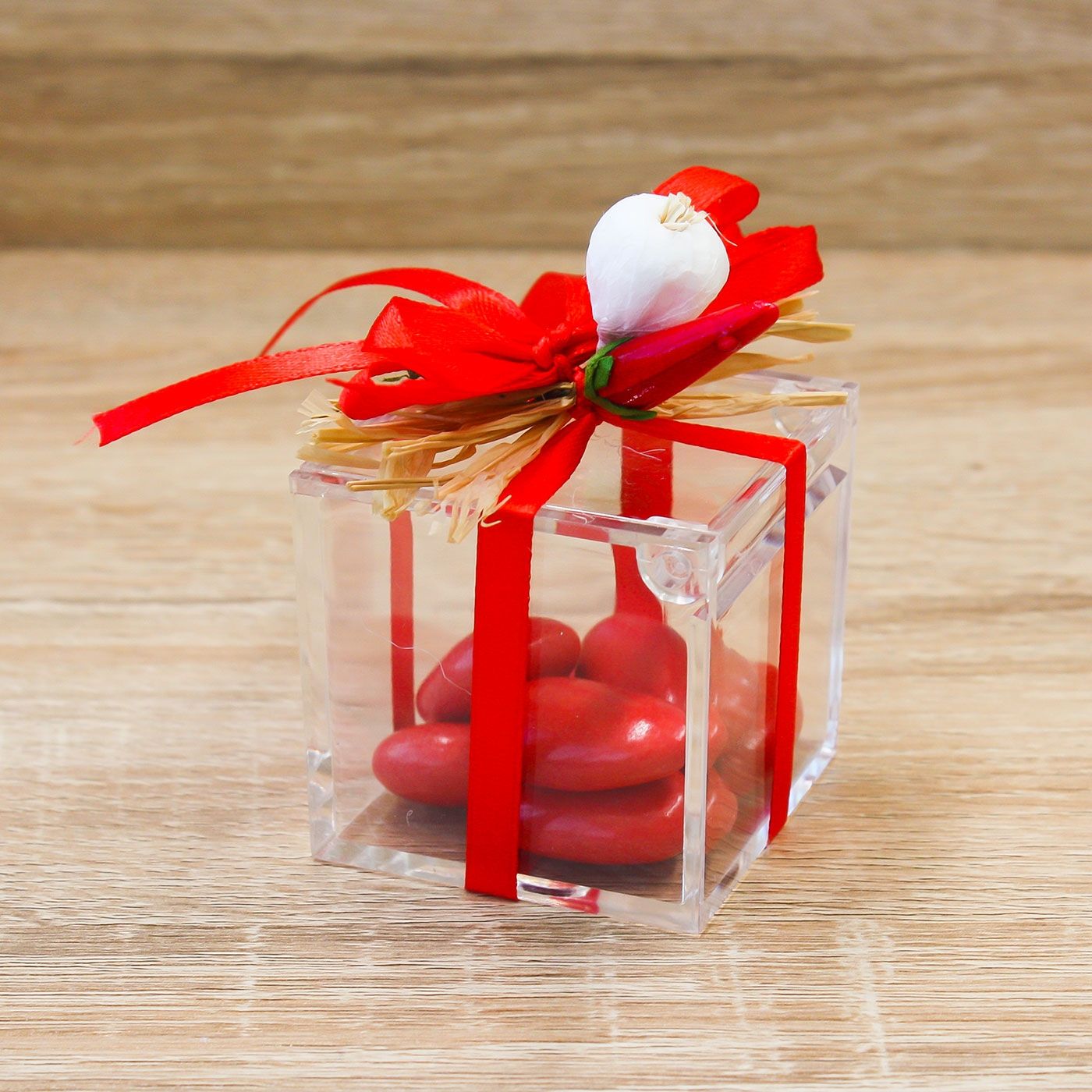 Cubo in Plex con rafia, 1 Peperoncino, 1 Aglio, Ciondolo Cornetto Rosso in Metallo doppio fiocco con raso rosso