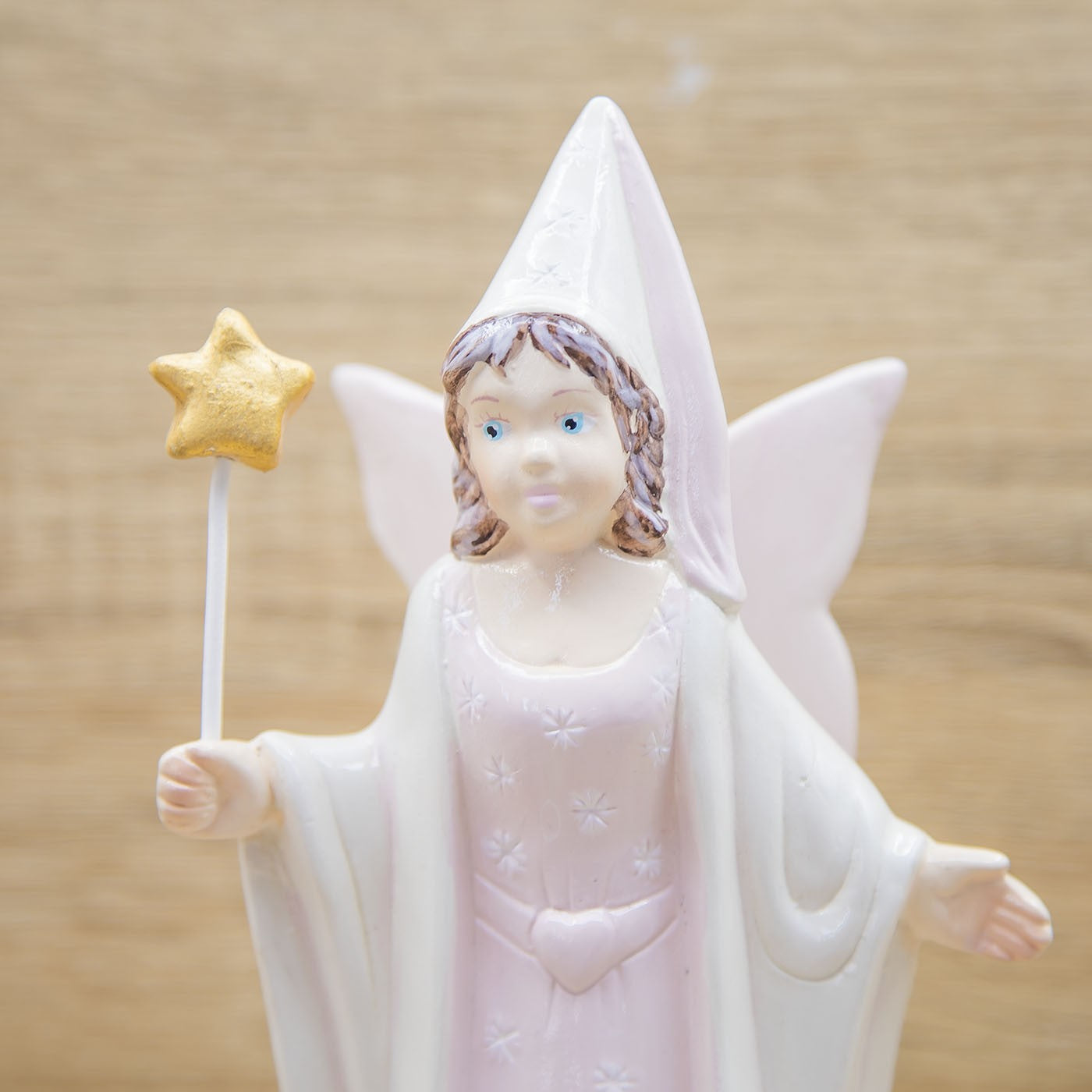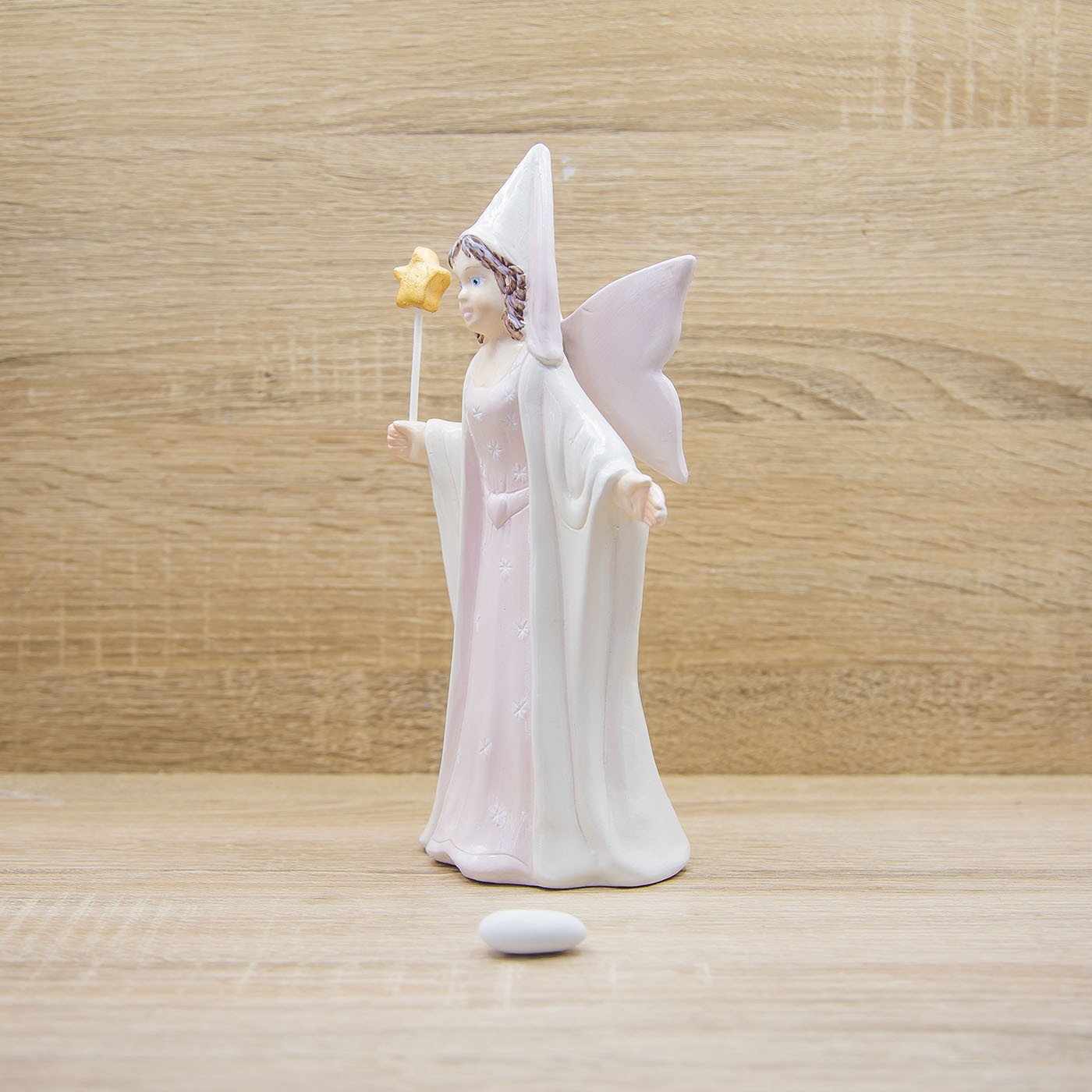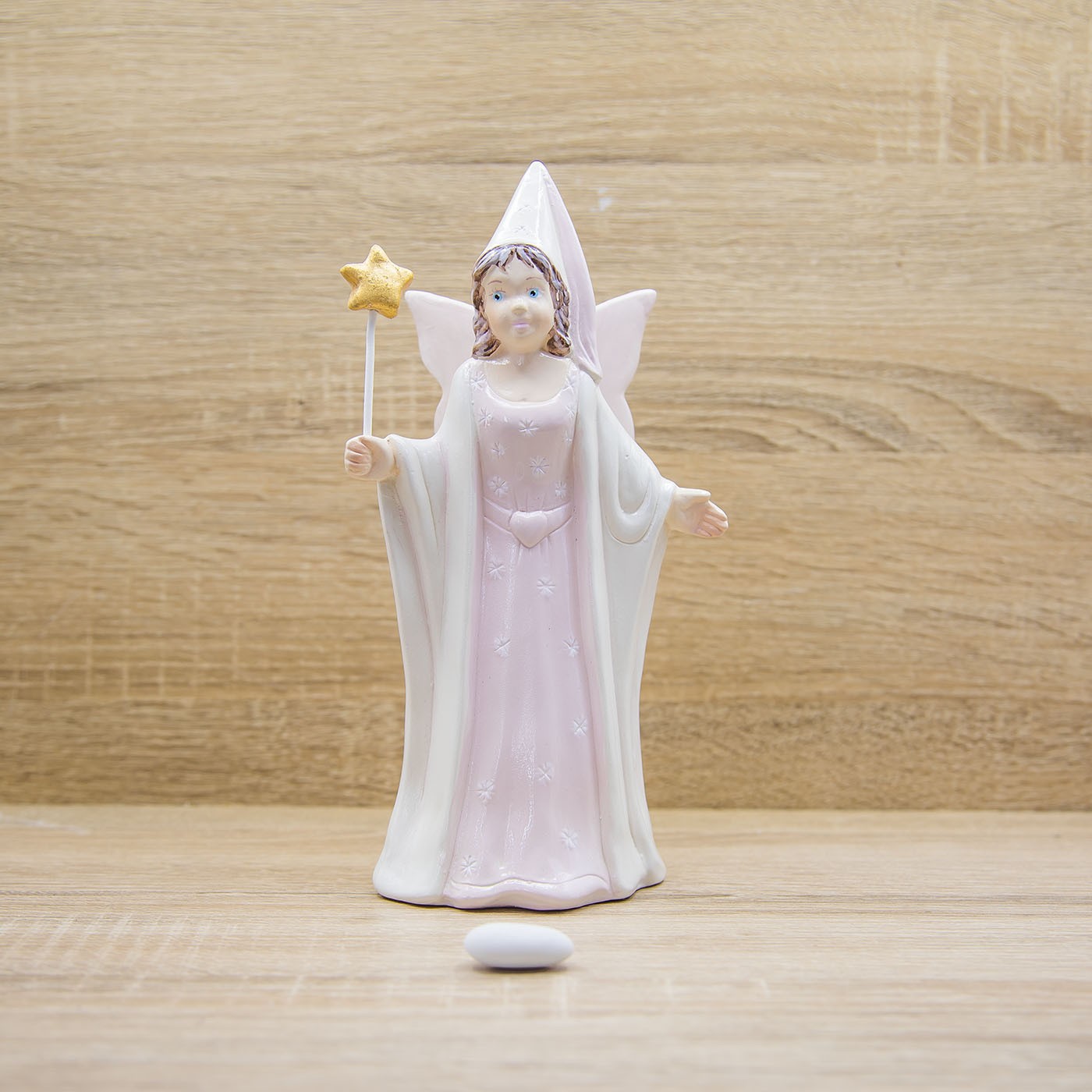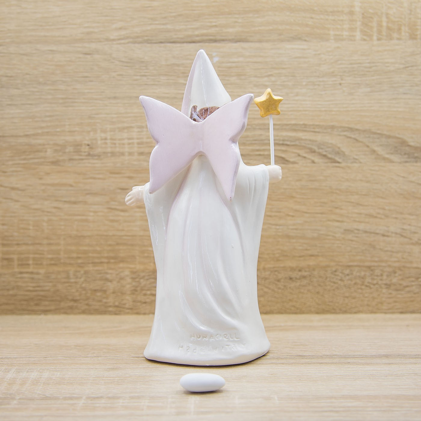 Fata Rosa in porcellana con Bacchetta Magica a forma di Stella e Ali, firmato Munaciell Made in Italy.