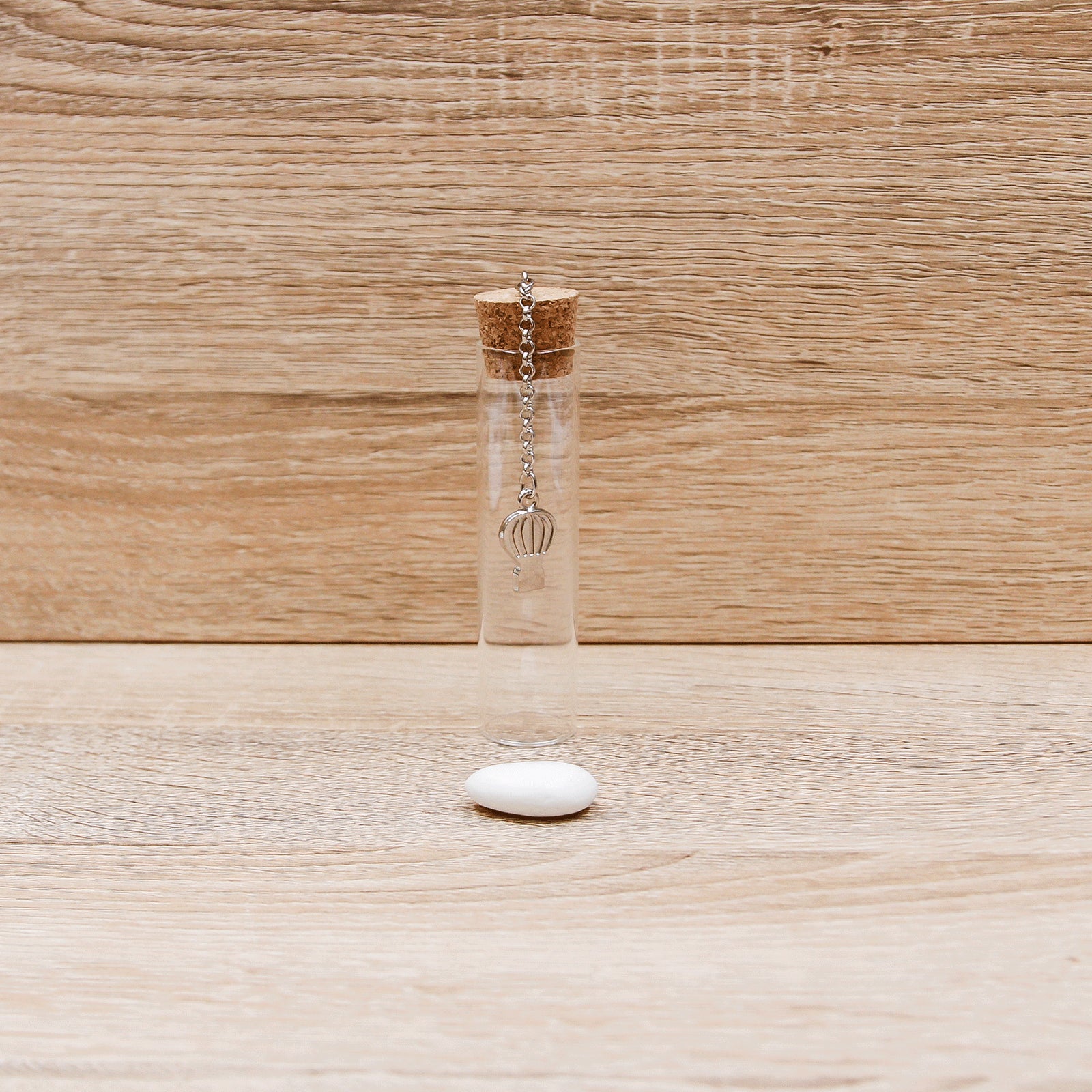 Fiala Portaoconfetti in Vetro con tappo in Sughero e come pendente troviamo una Mongolfiera in Metallo. - Made in Italy.