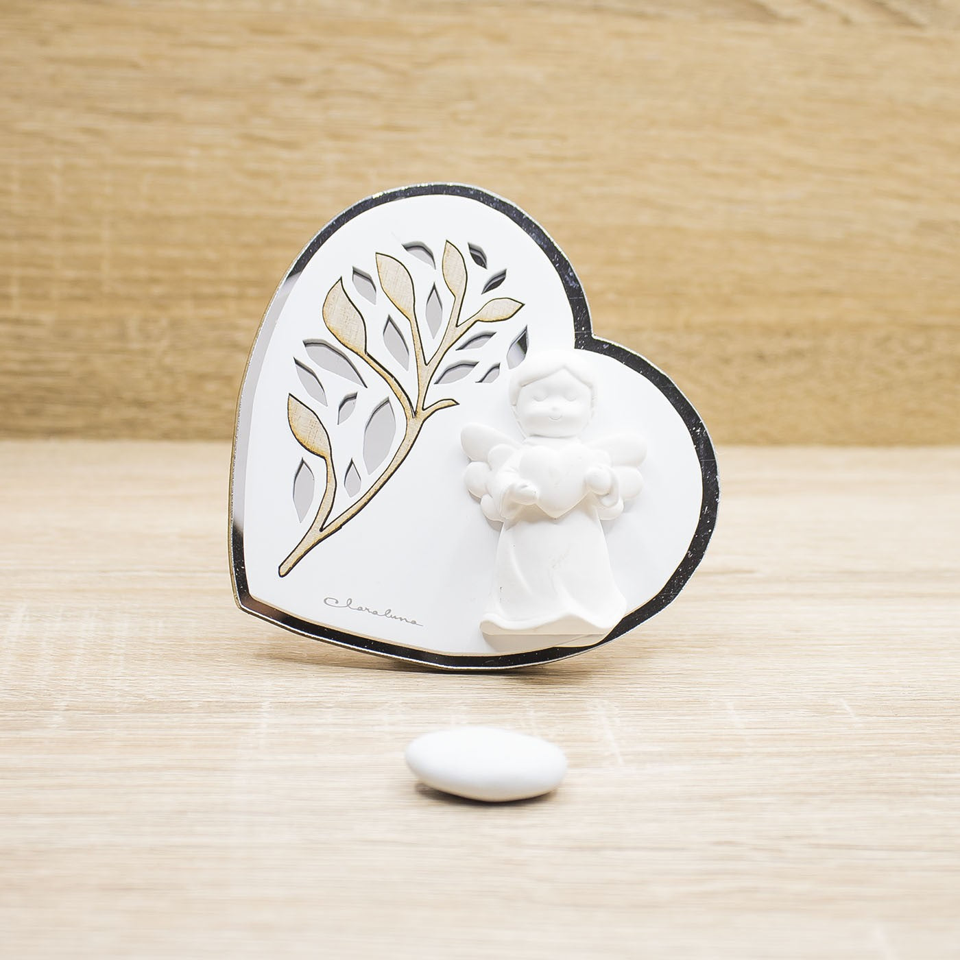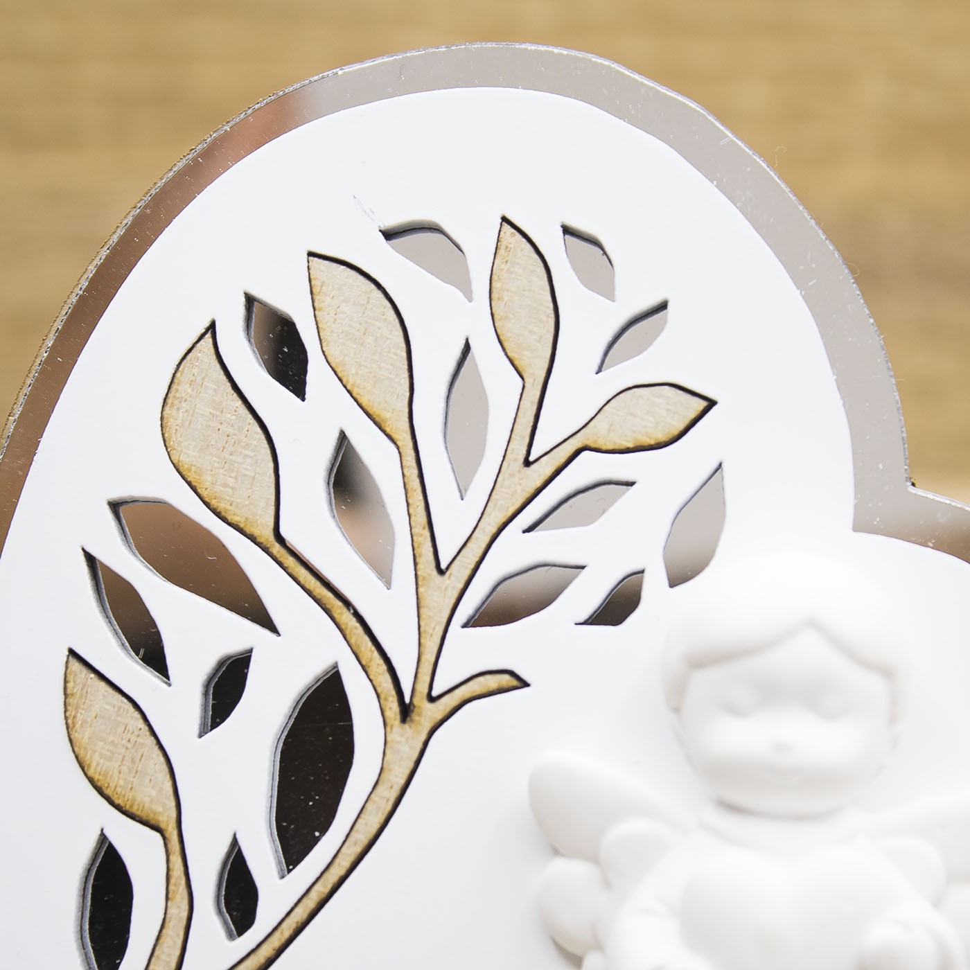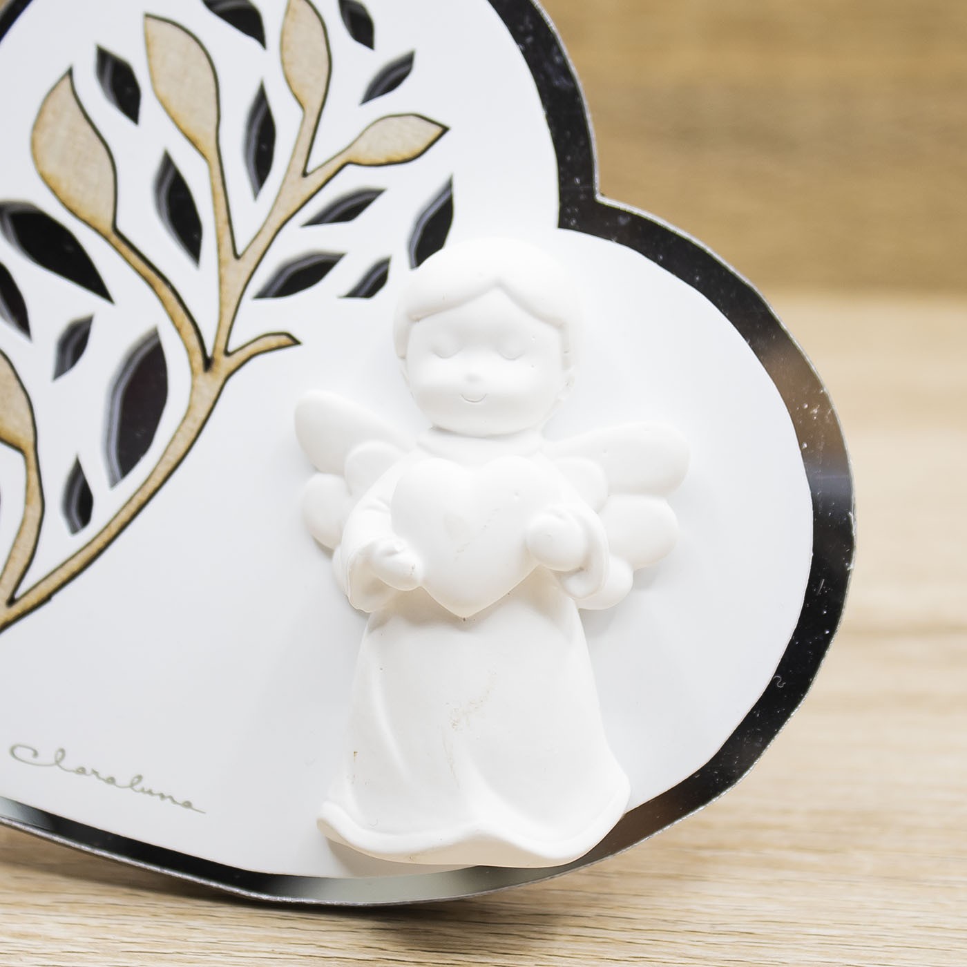 Icona a forma di cuore con foglie in legno e a specchio e applicazione di un angioletto, firmato Claraluna