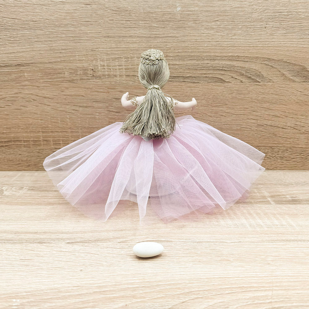 Bambola decorativa in porcellana con luce LED, vestita con elegante abito in tulle color rosa. La lampada LED integrata sotto la gonna crea una luce soffusa e decorativa. , firmato Averla Bomboniere.