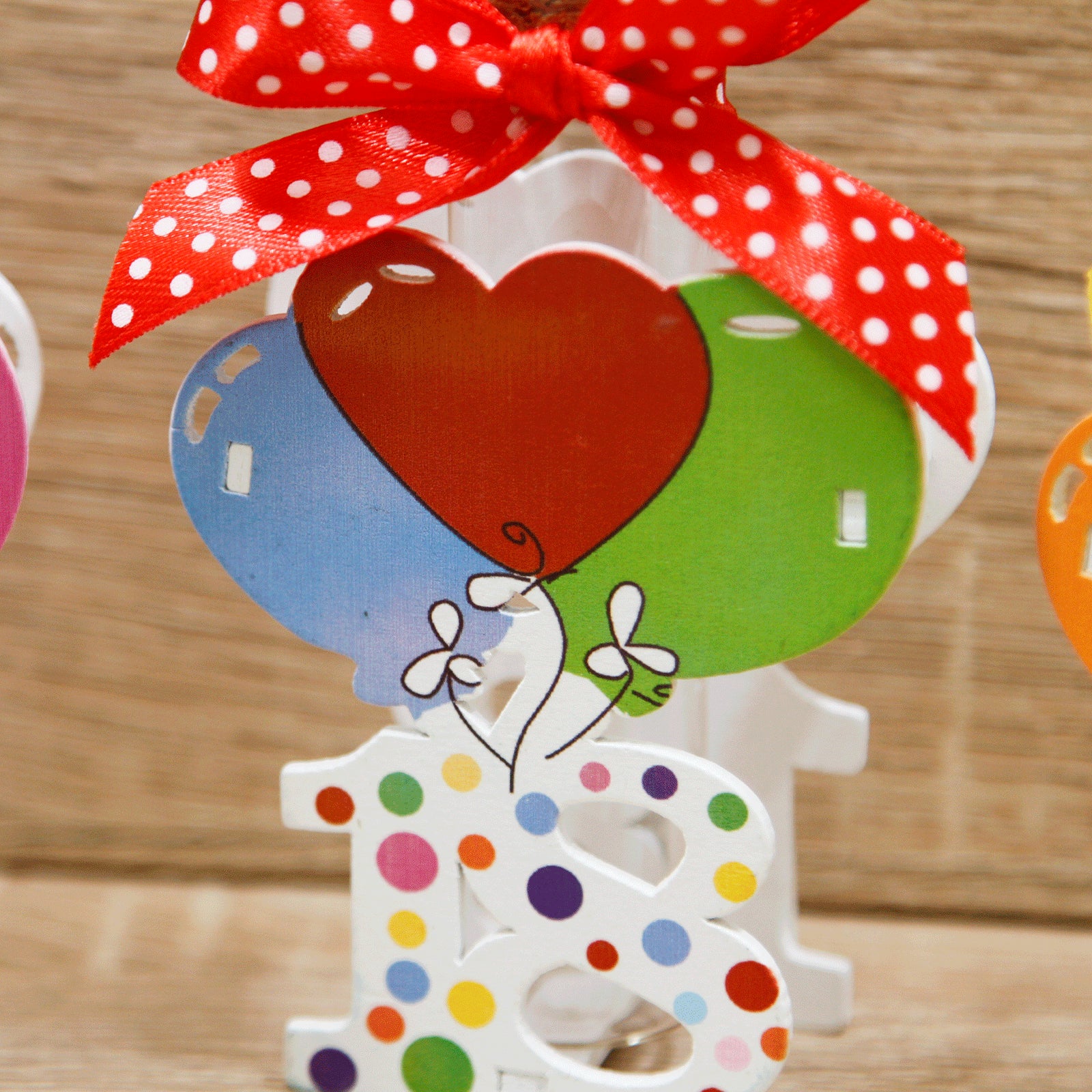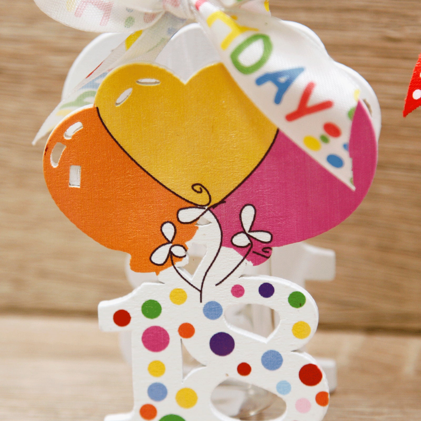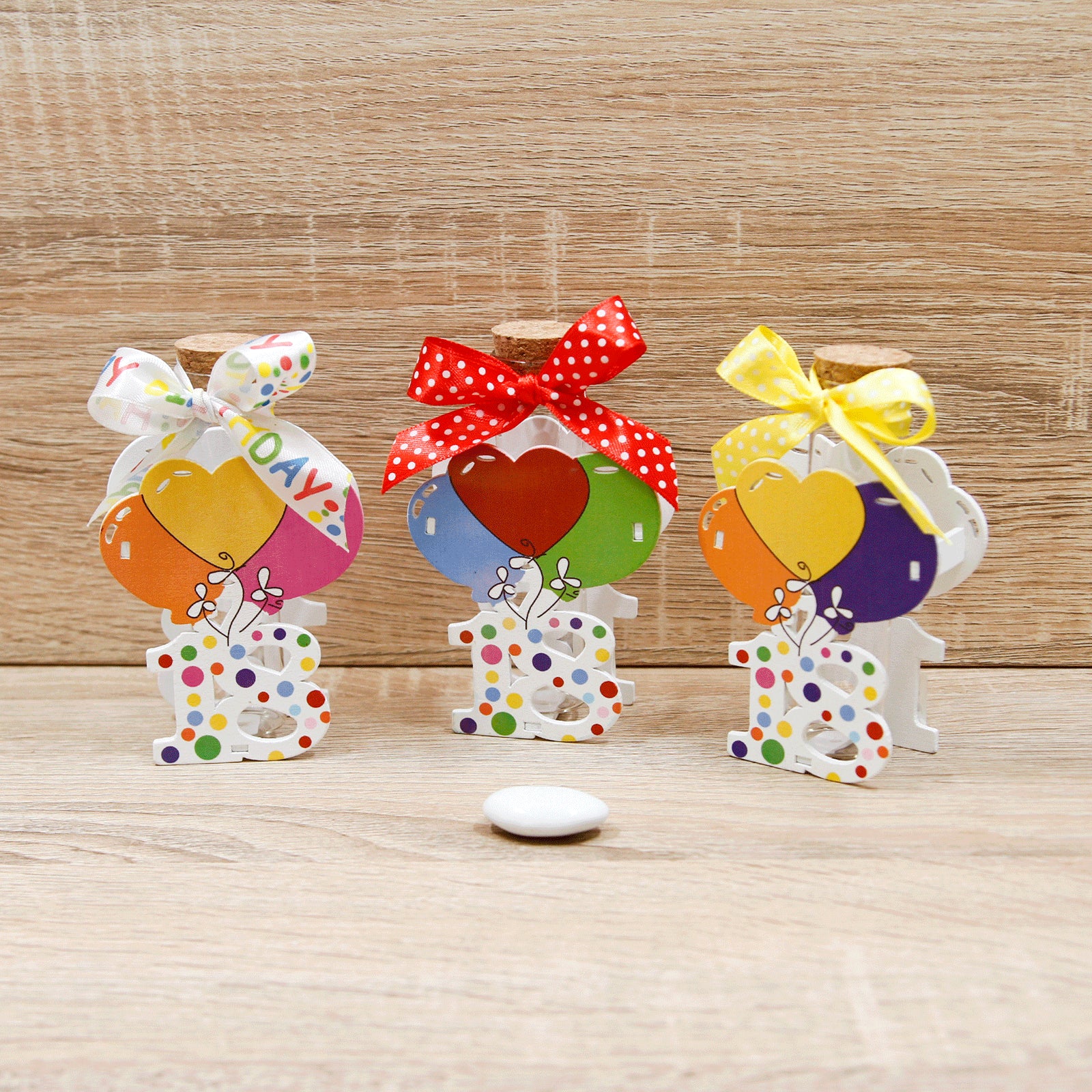 Portaconfetti Numero 18 a Pois Colorati con Palloncini Colorati. Fiala Portaconfetti in Vetro con tappo in sughero e Nastri Colorati.