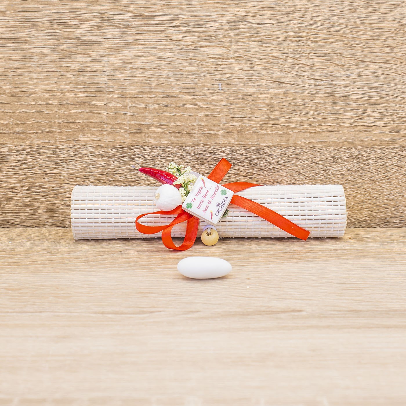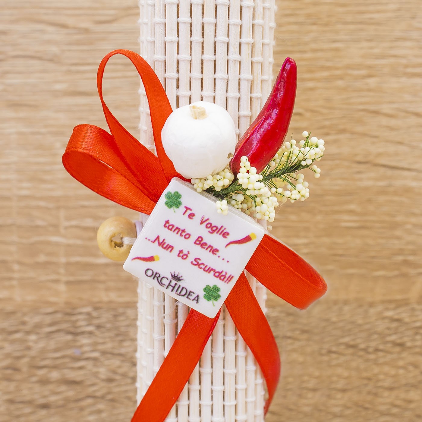 Portaconfetti a forma di tubo, nastro raso rosso, mattoncino con frase "Te Voglie tanto Bene... Nun tò Scurdà!!".