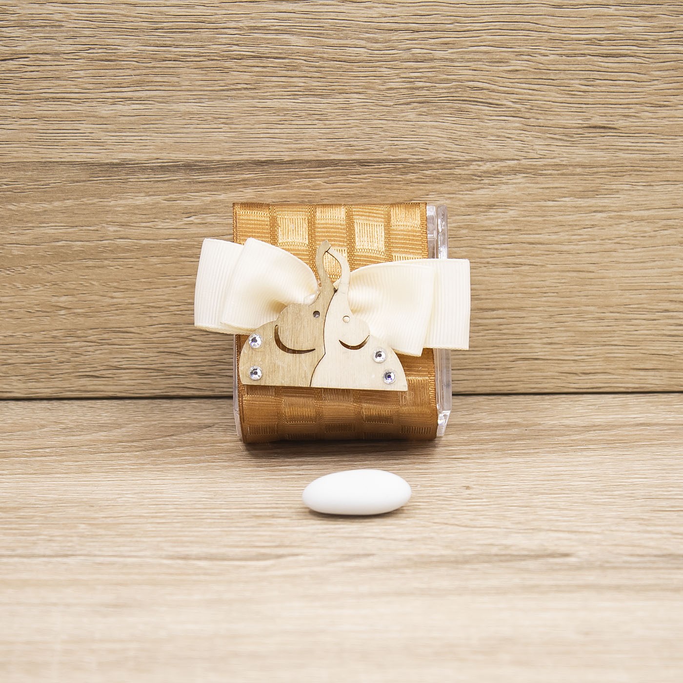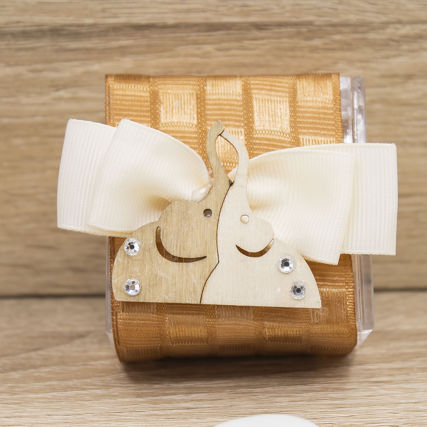 Portaconfetti con Nastro Largo Arancio, Doppio Fiocco, Applicazione di Elefantino Intrecciato con strass.