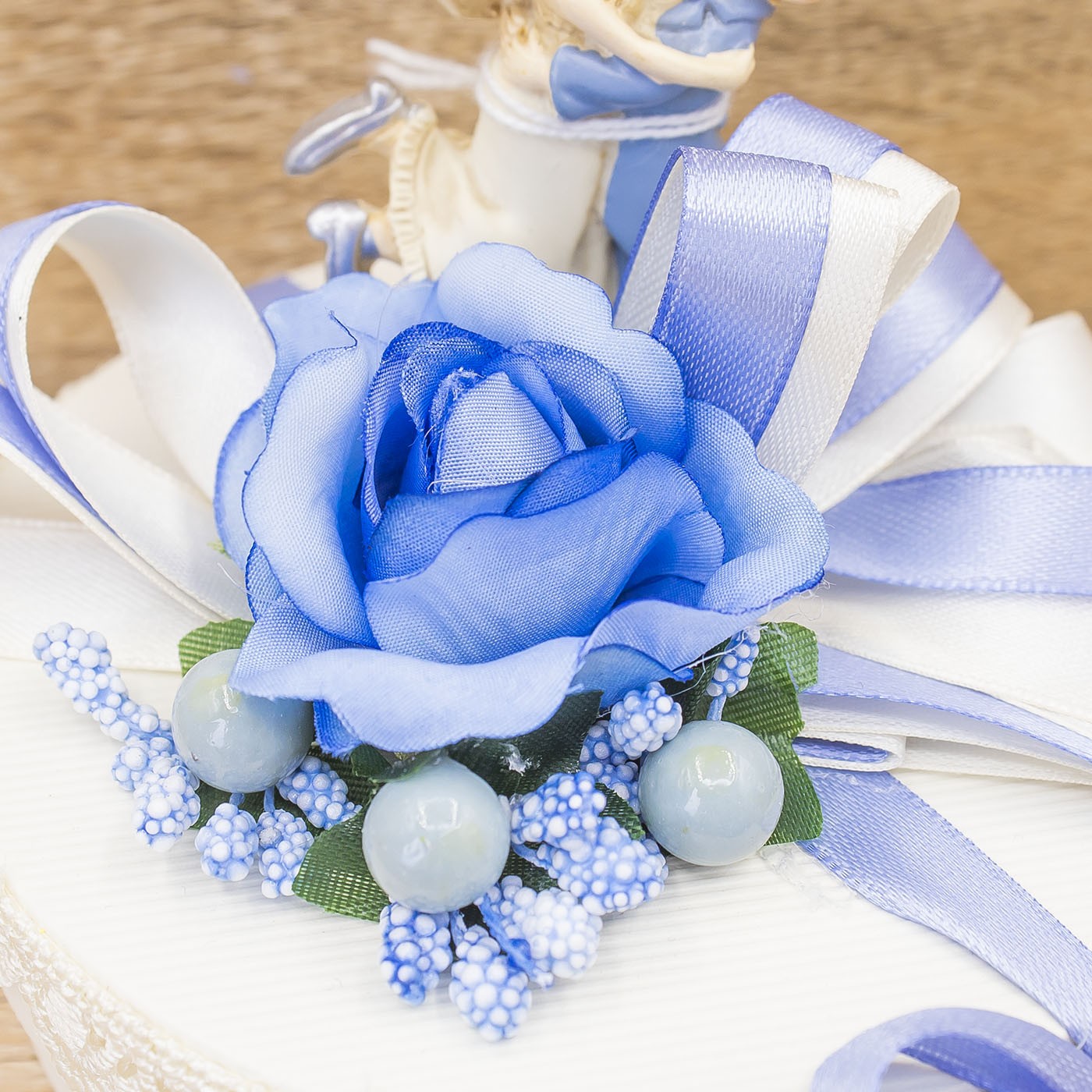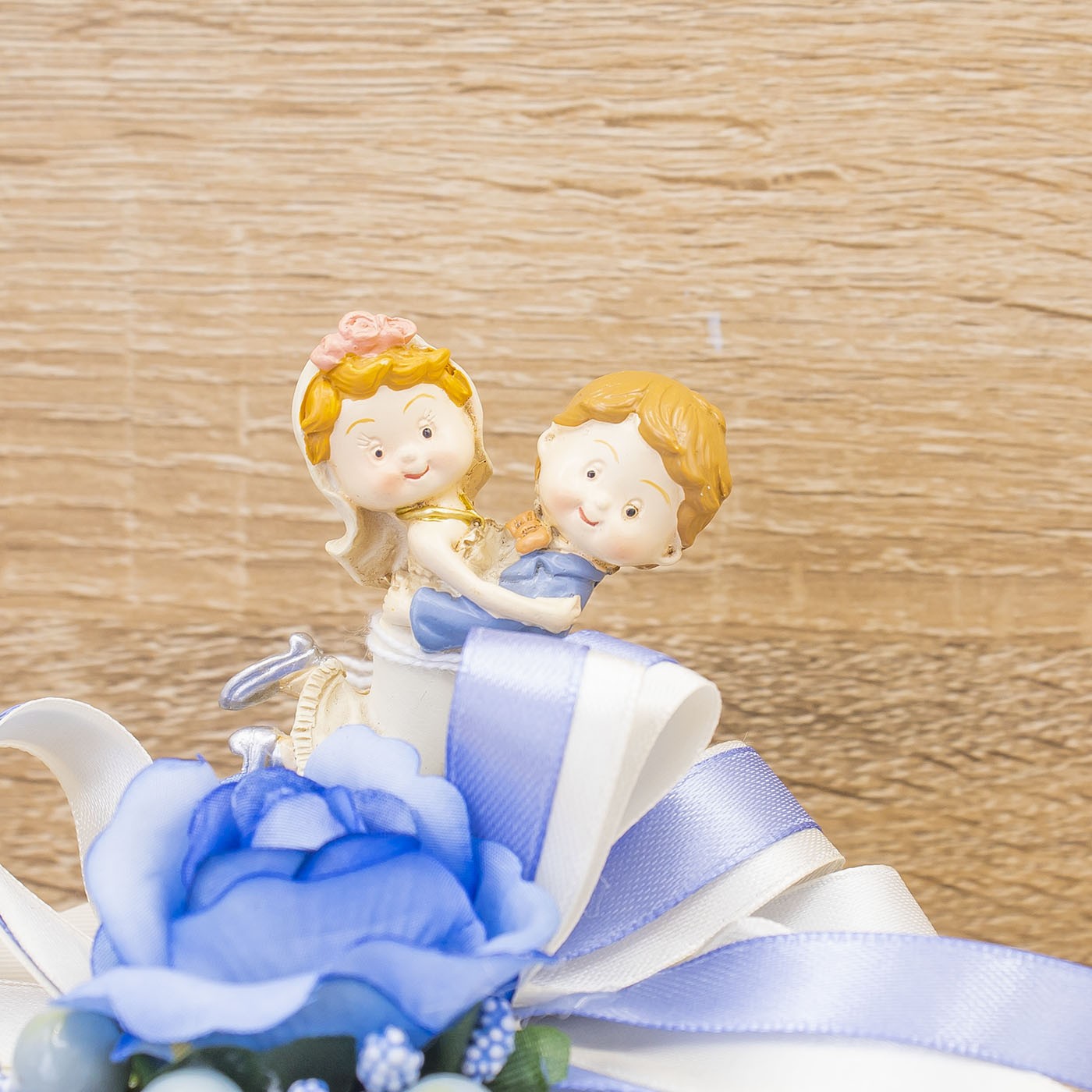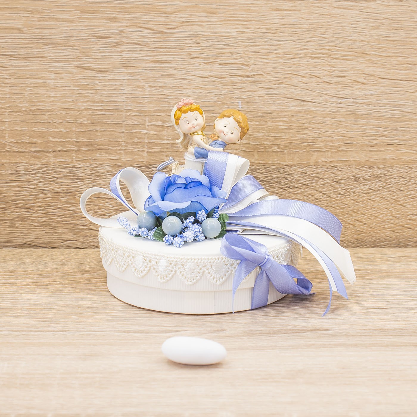 Portaconfetti tondo, nastro raso panna e lavagna, coppia sposi in resina, fiorellini e fiore in tessuto blu.