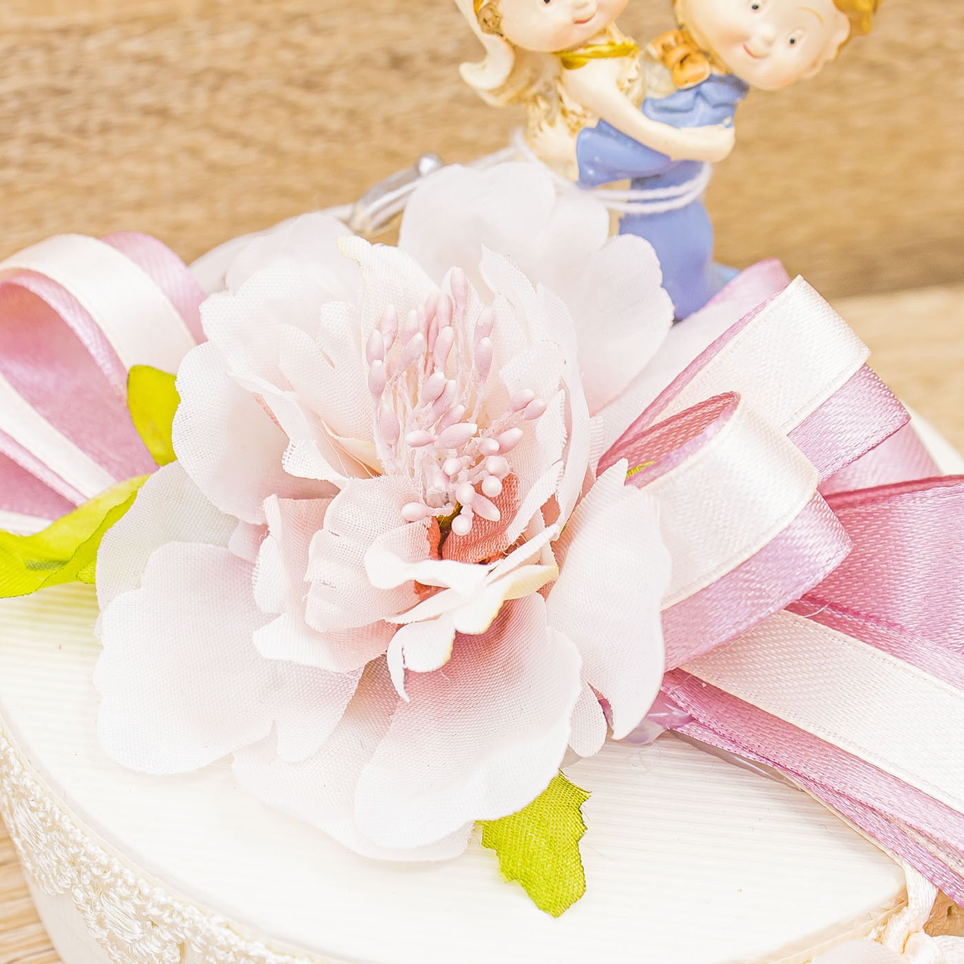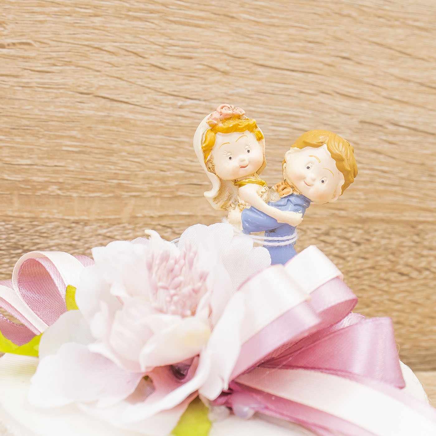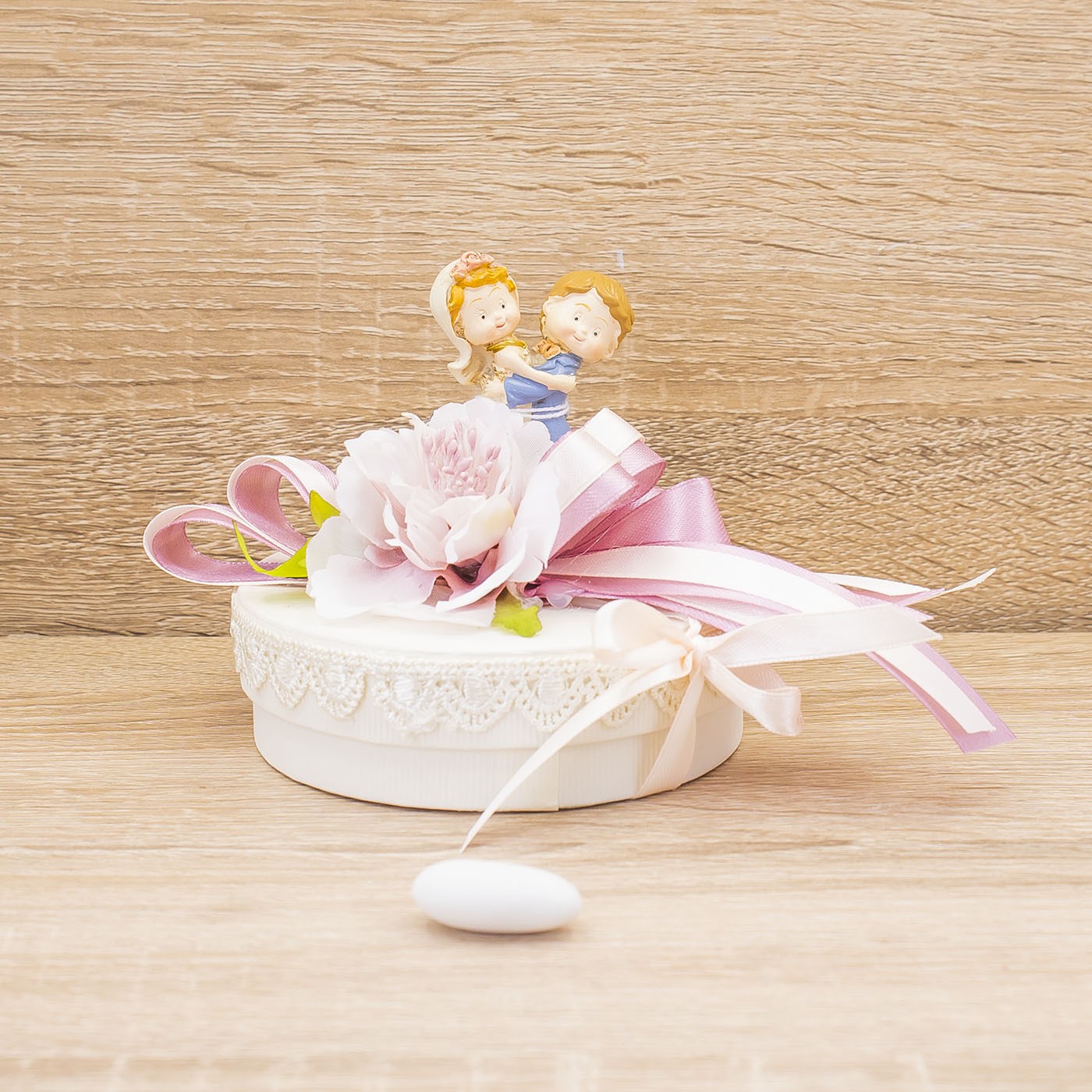 Portaconfetti tondo, nastro raso rosa skin e rosa antico, coppia sposi in resina e fiore rosa.