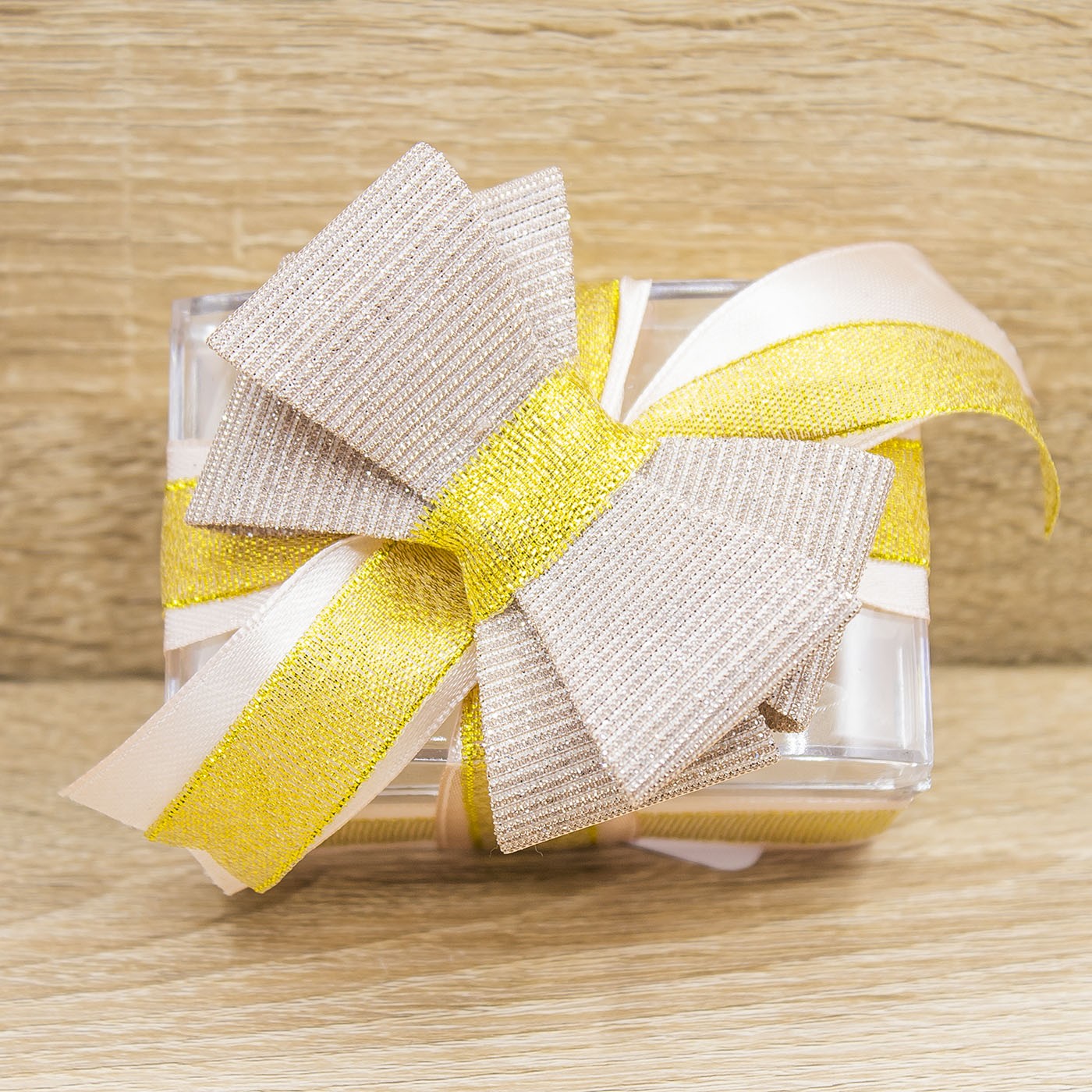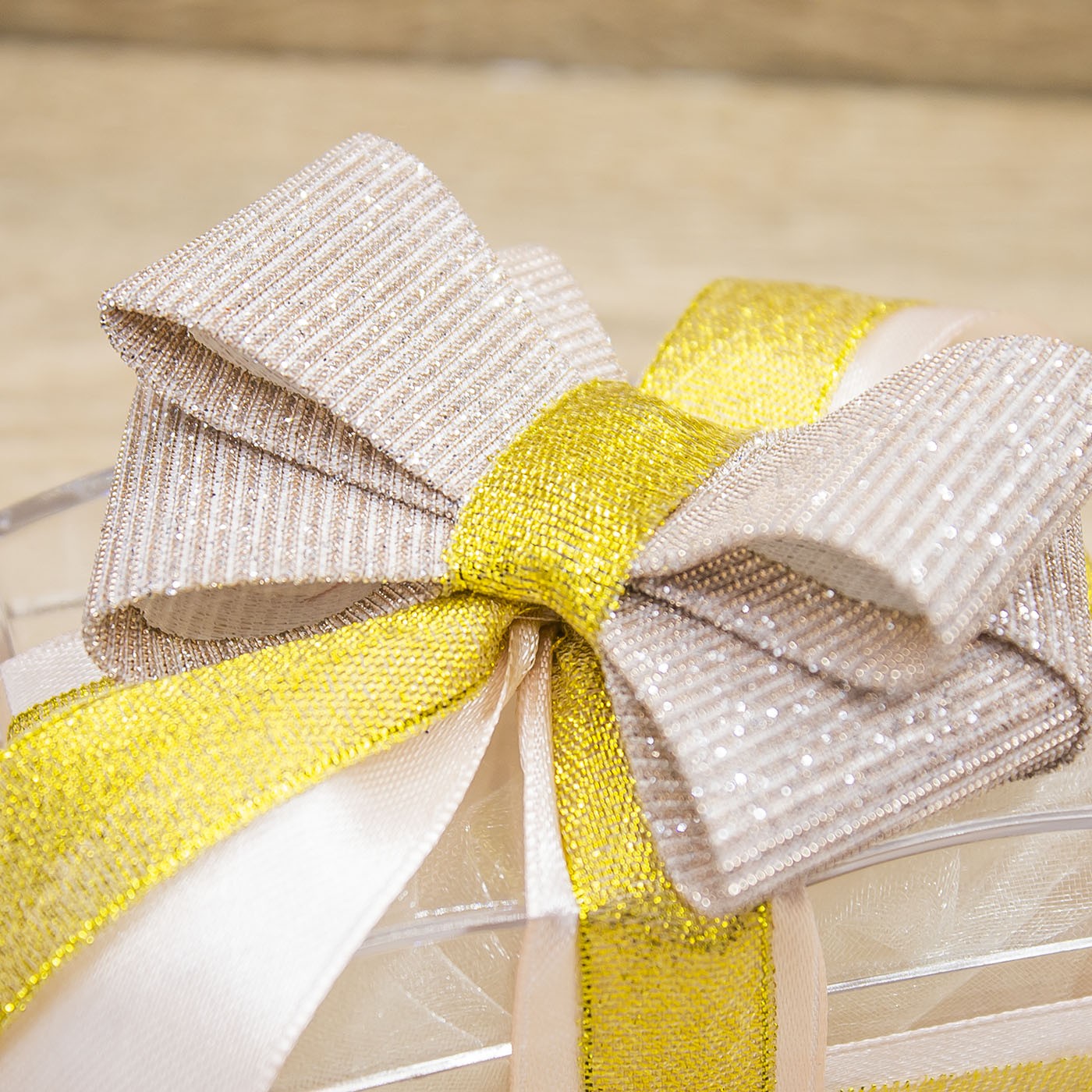 Bauletti Plex confezionati con Doppio Fiocco Rosa Cipria glitterato e nastro Rosa Cipria e Oro.