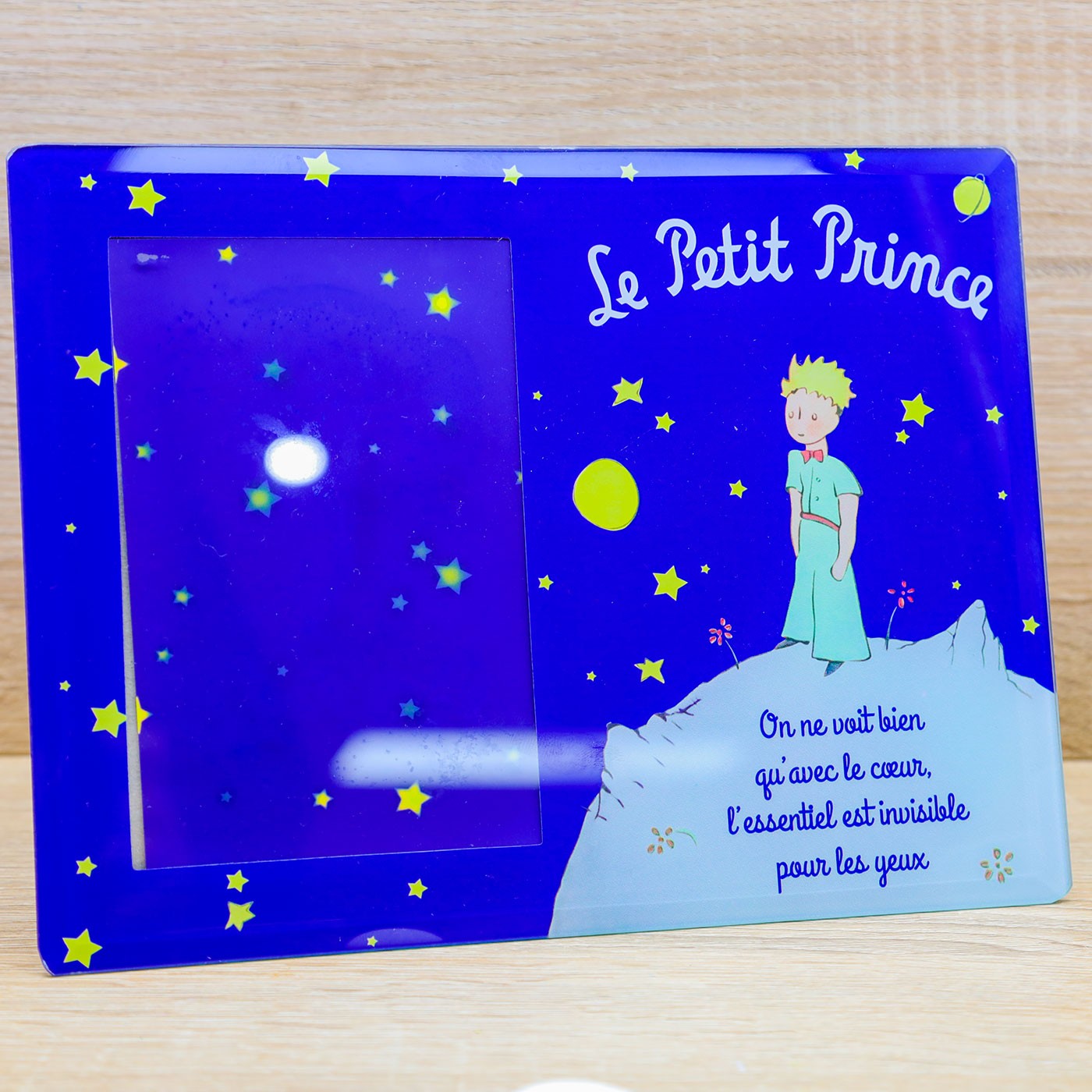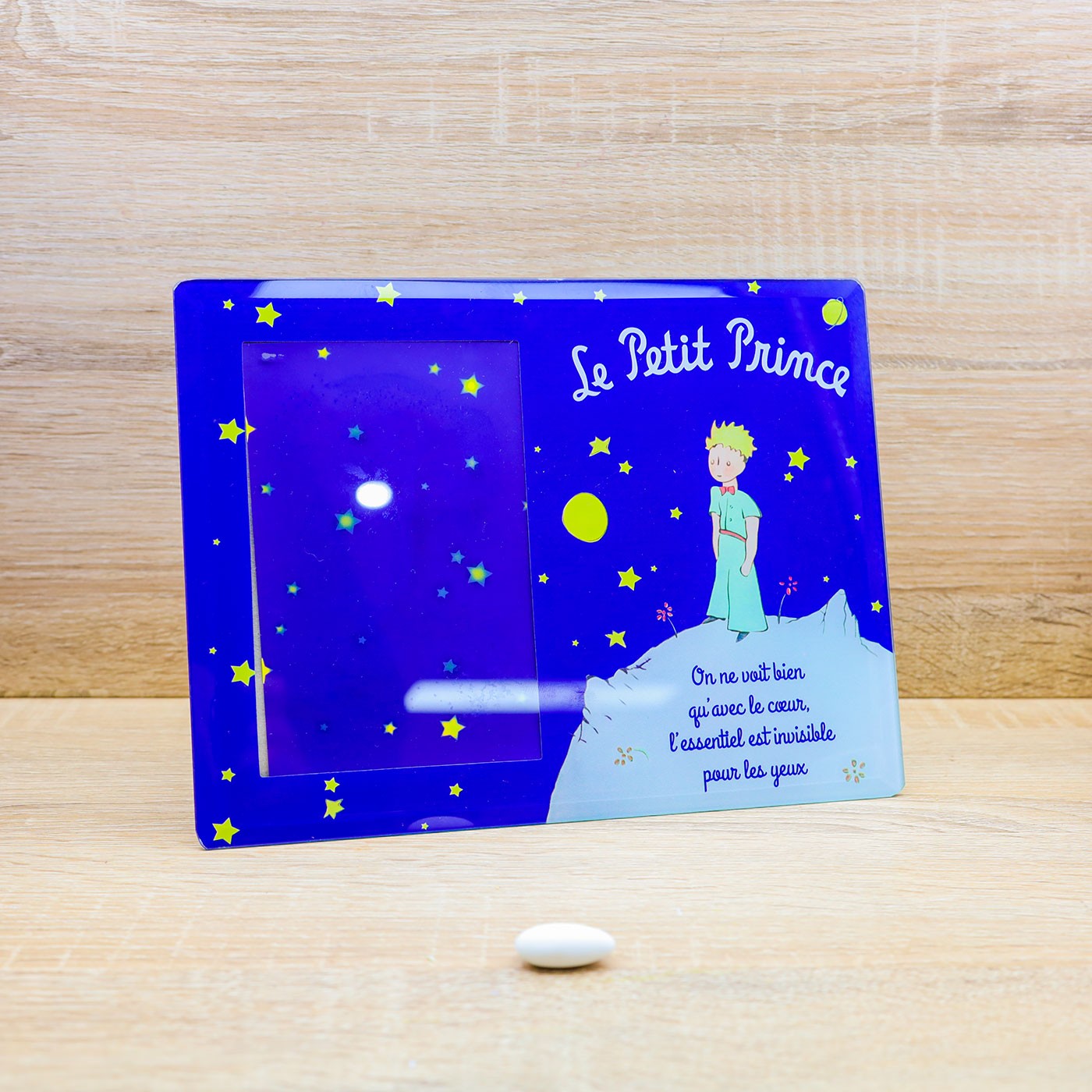 "Cornice portafoto in vetro con decoro del Piccolo Principe sul suo pianeta con la famosa citazione "Si vede bene solo con il cuore, l'essenziale è invisibile agli occhi". Disegni originali di Antoine de Saint-Exupery. Prodotto con licenza ufficiale de Il piccolo principe.