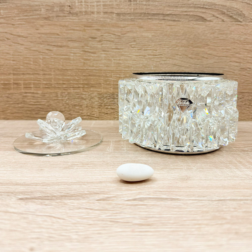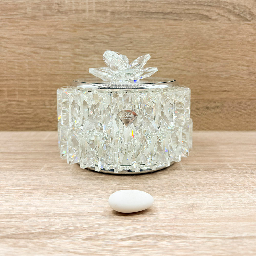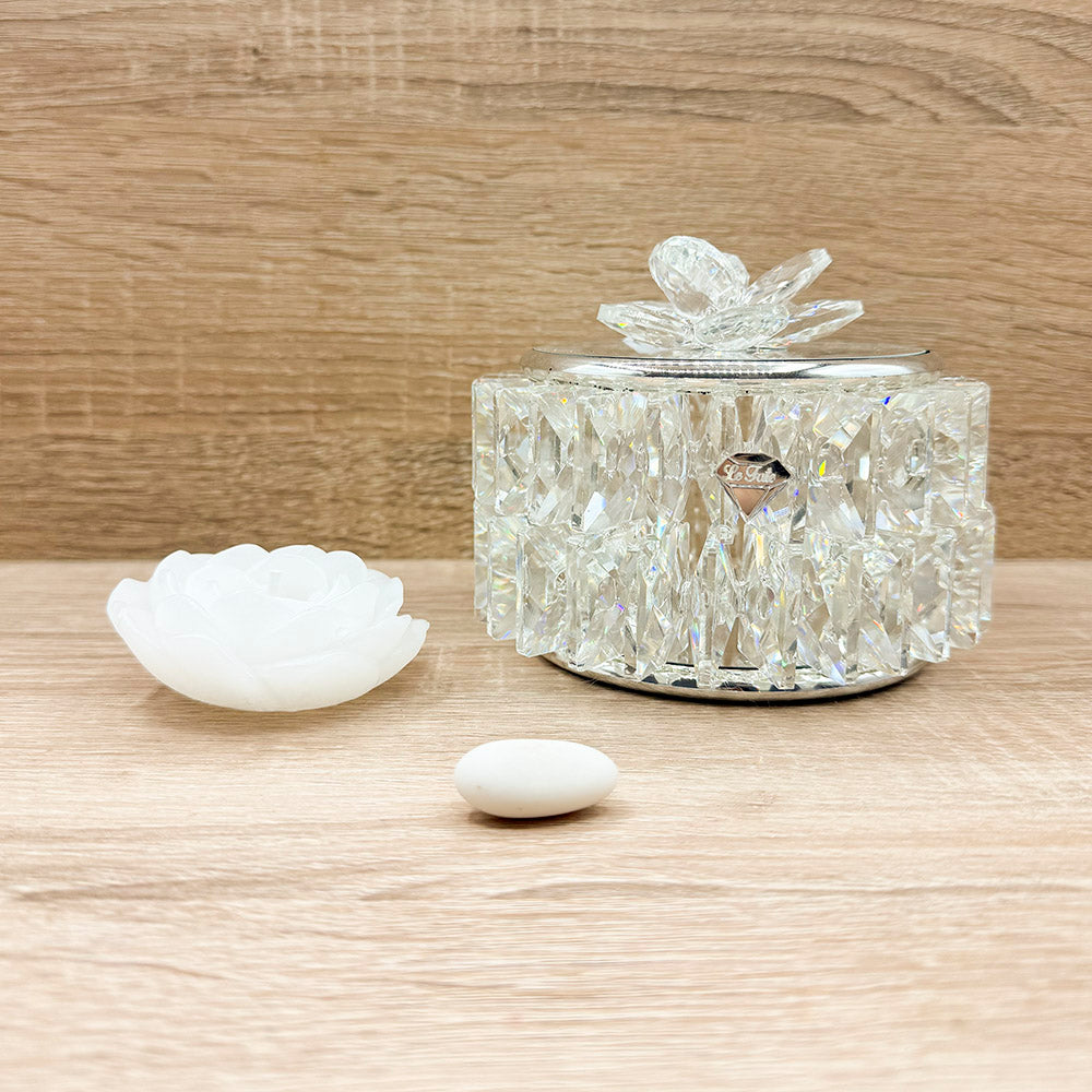Elegante Portagioie in cristallo finemente lavorato, con coperchio decorato da un fiore tridimensionale. Le superfici sfaccettate riflettono la luce creando splendidi giochi luminosi. Il bordo argentato aggiunge un tocco di classe. Con candela a forma di rosa.