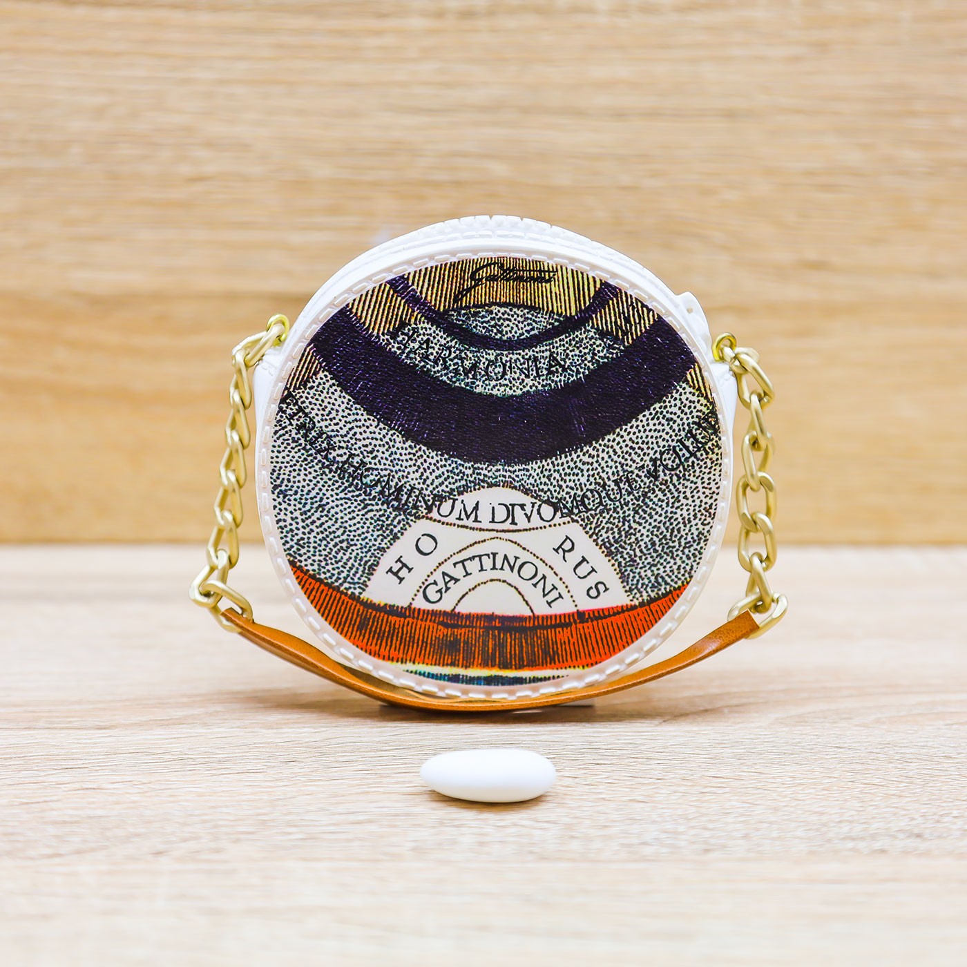 Profumatore bifacciale a forma di Borsetta tonda con manici in pelle e decori tipici del marchio Gattinoni.