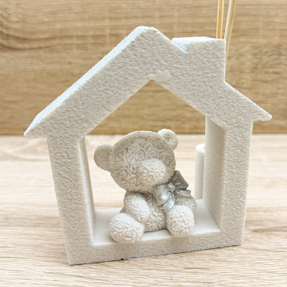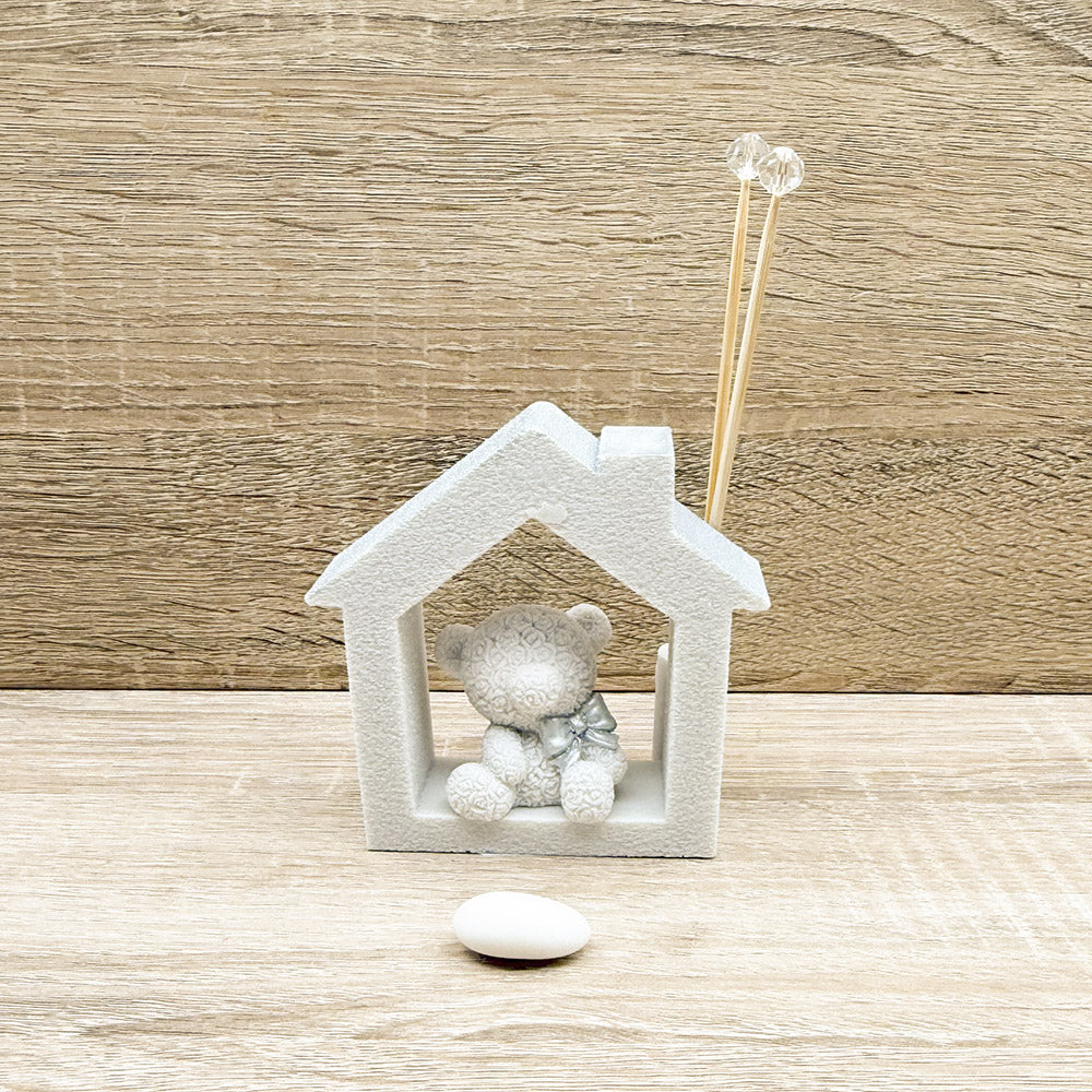 Profumatore Casetta con Orsetto con cuoricino argento, firmato Orchidea Bomboniere.