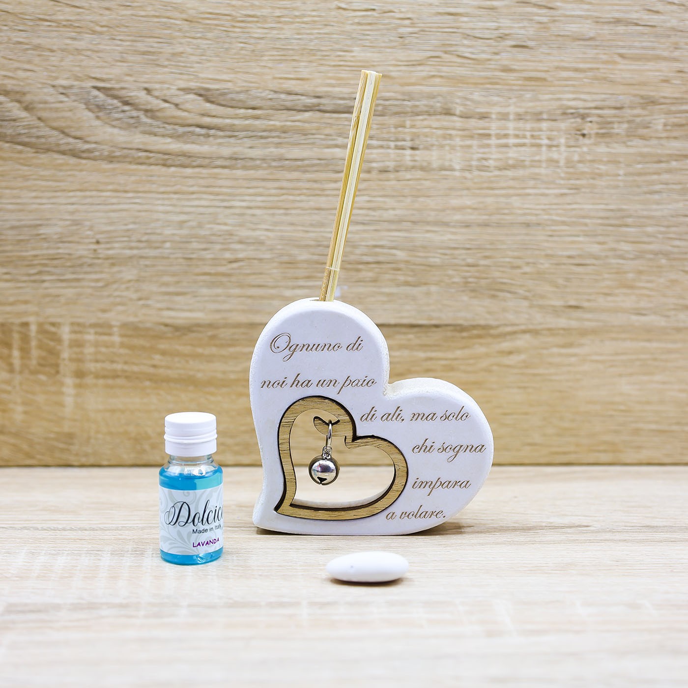 Profumatore a forma di Cuore, ciondolo con sonaglino e frase "Ognuno di noi ha un paio di ali, ma solo chi sogna impara a volare" , firmato Dolcicose