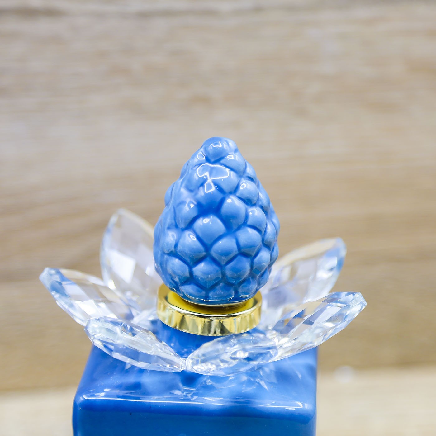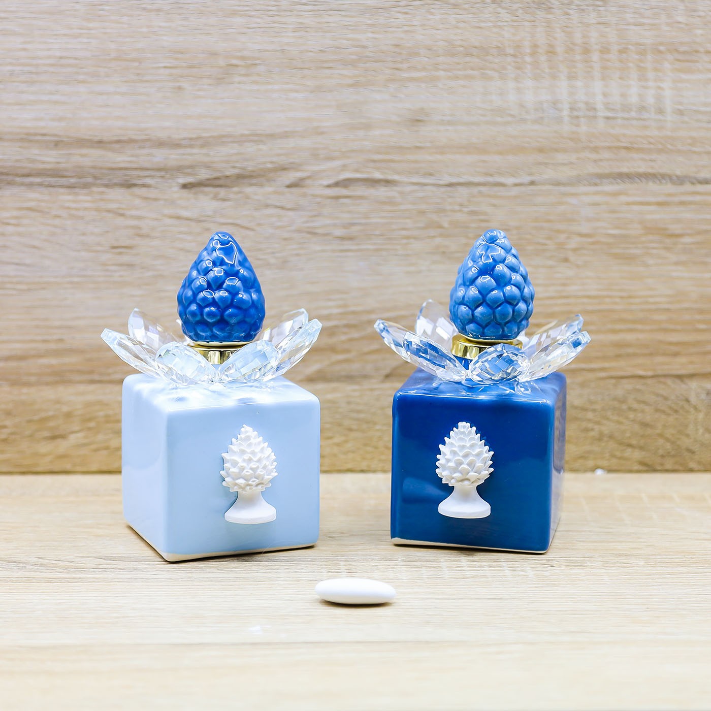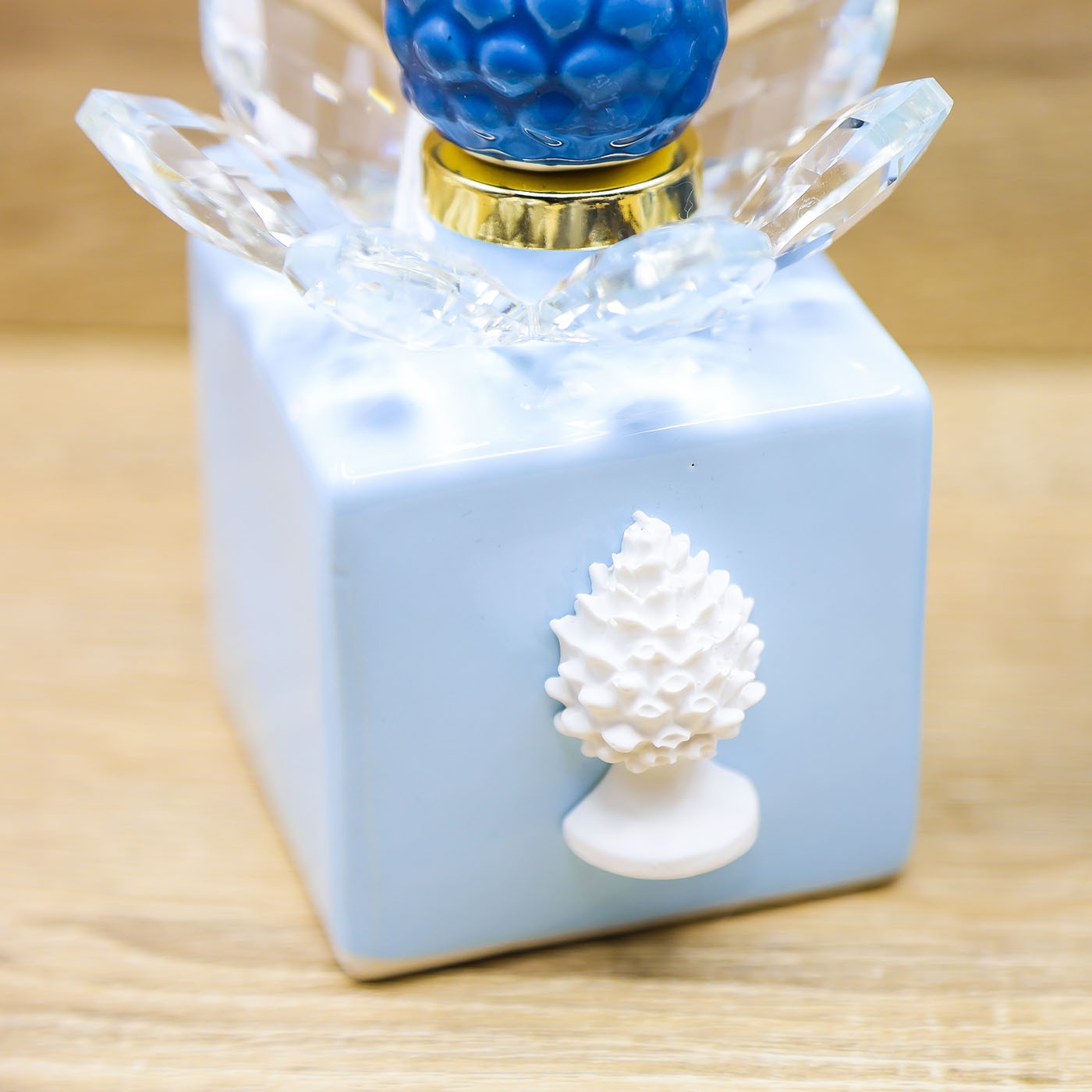 Profumatore in vetro con tappo a forma di Pigna in porcellana, petali in cristallo e pigna bianca, firmato Marilyn Rome.