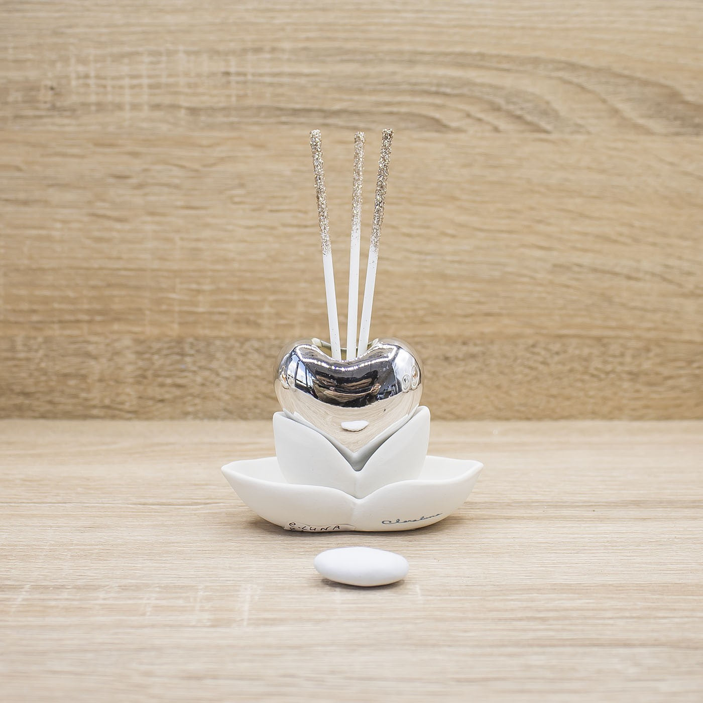 Il prezzo con la confezione comprende: Profumazione, Bastoncini Glitterati, Astuccio, Doppio Nastro, Gessetto o Fiore a Scelta, Portaconfetti e 5 Confetti.